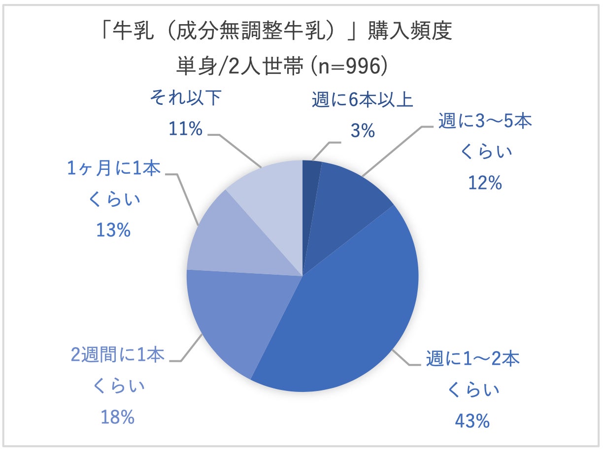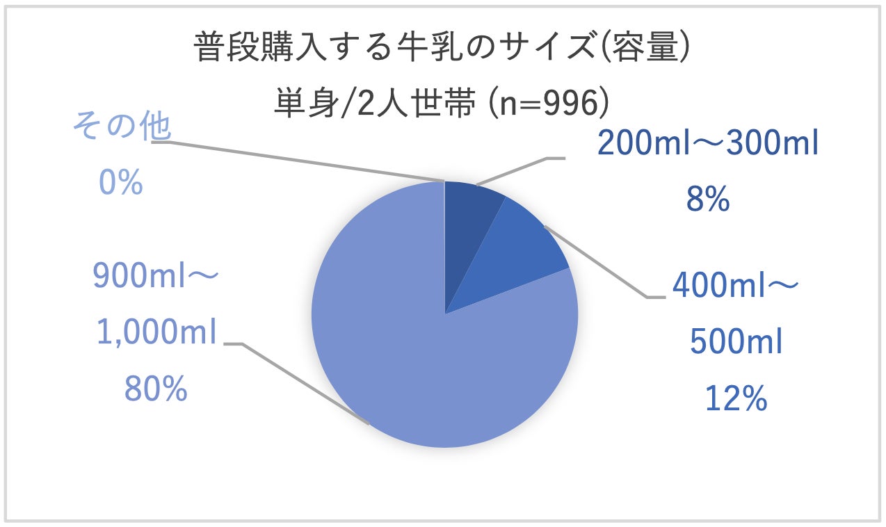 今回当社が行った調査では、世帯人数が単身または2人の少人数世帯における牛乳の購入について、購入頻度は低いが、900~1000mlの大容量サイズを購入して、飲み切れずに廃棄していることが伺えました。飲み切れずに廃棄している人の半数では「500mlと1000mlの中間サイズの牛乳があれば便利だと思う」と回答しています。