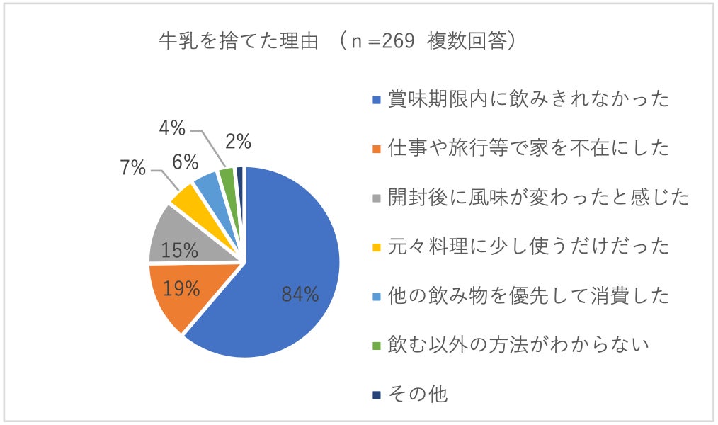 牛乳を捨てたことがある人のうち、その理由は賞味期限切れが最も多く、8割以上にのぼりました。