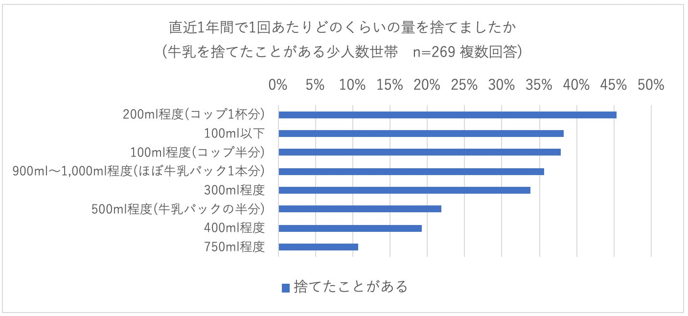 牛乳を捨てたことがある人のうち、捨てる量は200ml程度か、それ以下が多いことがわかりました。