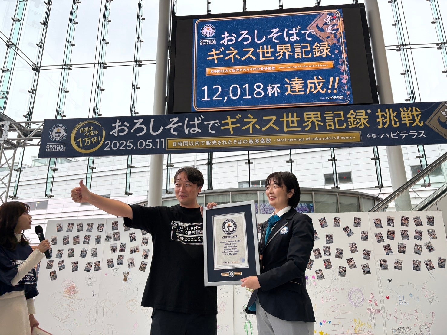 株式会社宗近(福井県越前市北町45-63-1)は、2025年5月11日(日)に「8時間以内に販売されたそばの最多食数」に挑戦し「12,018杯」で世界No.1としてギネス世界記録(TM)に認定されたことを発表いたします。