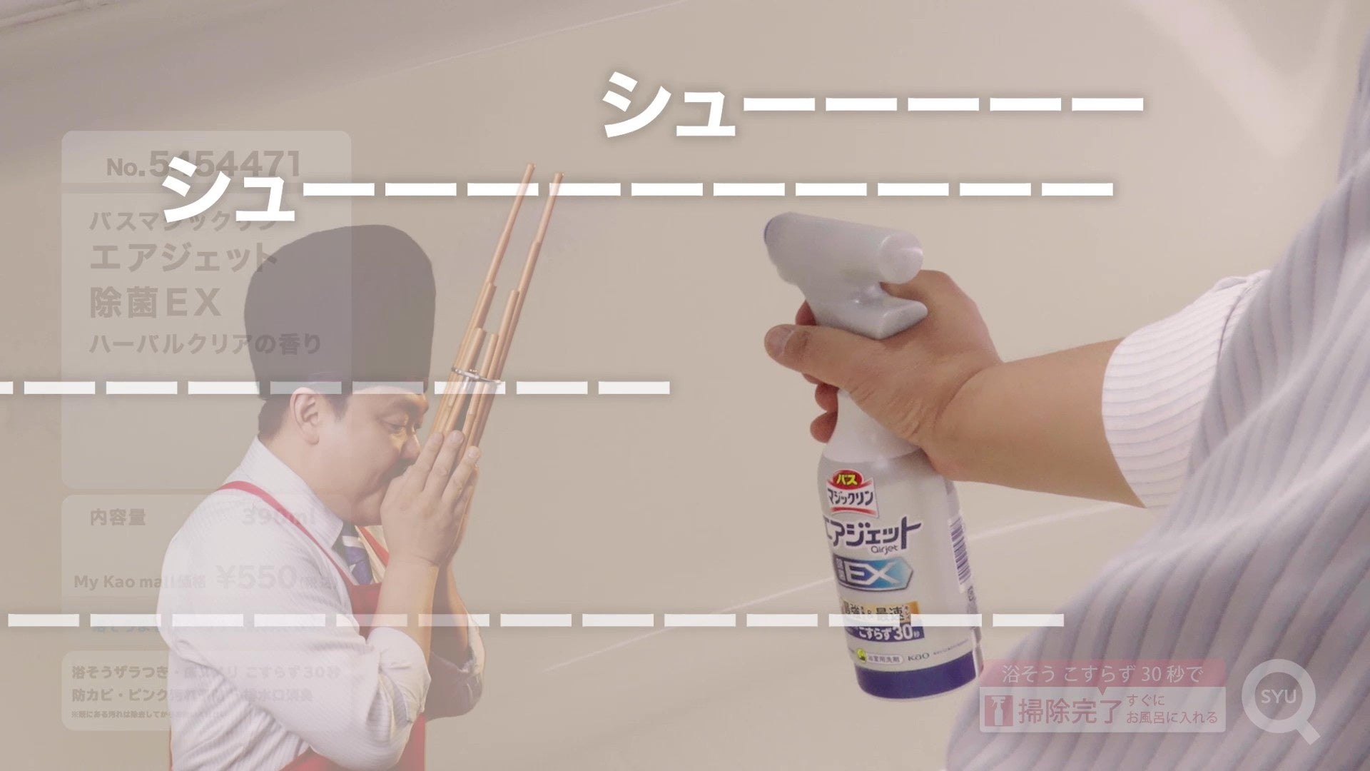 福島さんと石川さんの商品紹介シーンからスタートし、「バスマジックリン エアジェット」シリーズの「シューーーーーーッ」というスプレーの吐出音に合わせて、福島さんが雅楽奏者、ボクサー、オーケストラ奏者といったユニークなキャラクターに次々と変身。広い面にもラクにスプレーできて、“こすらず汚れが落とせる”ストレスフリーで軽やかな使い心地を、多彩な演出でコミカルに描いています。