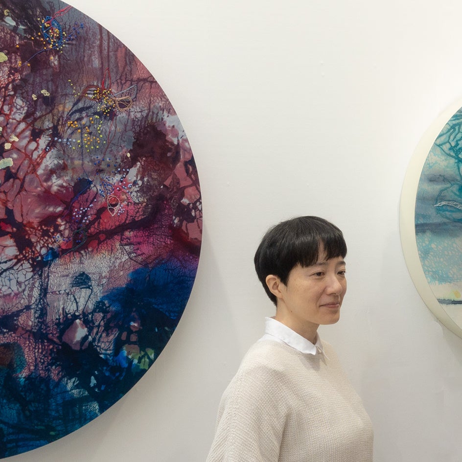 展覧会初日には植物の細胞壁に着想を得た多角形作品《胞膜》シリーズが約10メートルにわたる壁面を連続して彩ります。その後はオフィス空間に作品が点在することで、空間との関係性を築きながら展示を展開します。さらに、記憶の中に咲く草花に呼び起こされた風景の連想から生まれた新作《Bouquets》シリーズは会期中に広がり、季節の移ろいや自然の賑わいを感じさせるでしょう。