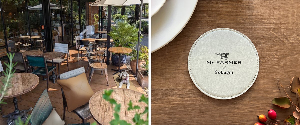 今回はその第二弾として、愛犬家が多く集まる駒沢オリンピック公園に隣接し、ペットフレンドリーな空間が人気の「Mr.FARMER 駒沢オリンピック公園店」とコラボいたします。コラボ期間中、秋風が心地よいMr.FARMERのテラス席のクッションやランチョンマット、コースターは、Sobagniのエシカル合皮で彩られた特別仕様となります。またお散歩後の愛犬が快適に過ごせるよう、地面の熱や冷えから守るエシカル合皮製のペットマットも設置いたします。自動車のシートにも使われるほどの高い耐久性に加え、水や汚れに強く、お手入れが簡単な素材なので、愛犬とのカフェタイムで起こりがちなトラブルにも安心です。