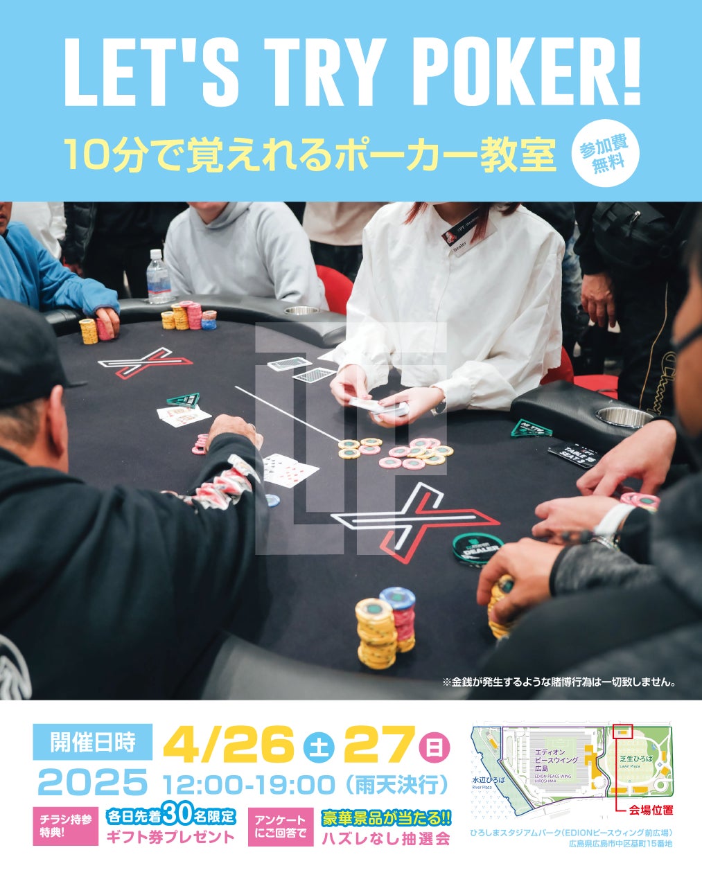 【広島市】 完全無料!未経験者・ファミリー大歓迎!『10分で覚えれるポーカー教室!『 LET'S TRY POKER ! 』