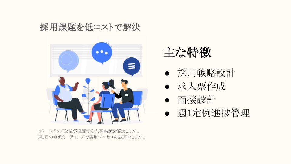 人事部門がないスタートアップ・ベンチャー企業の採用活動をサポート。低コストで採用戦略から実行までのワンストップソリューションを提供。