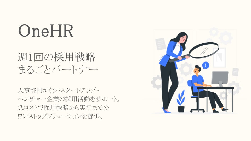OneHRは創業間もない時期〜人事部門がいない(代表取締役が人事を兼任している)ベンチャー企業を対象に、週1回の採用戦略パートナーとしてご活用いただけます。