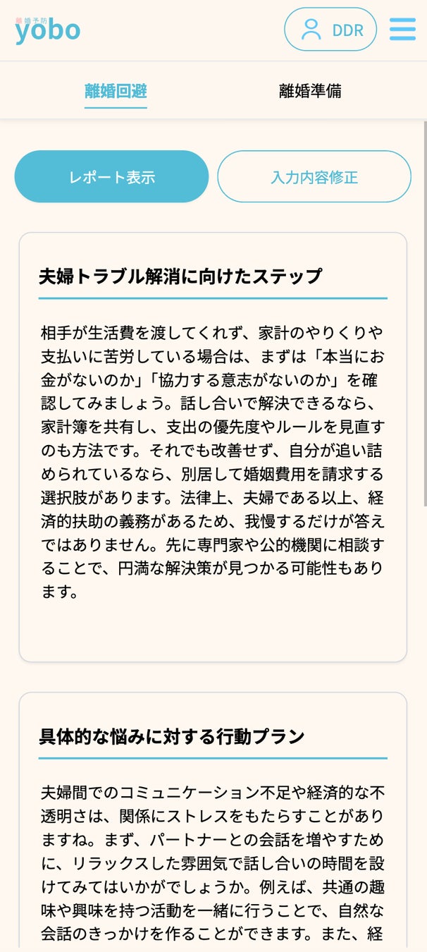 養育費や財産分与、離婚の悩みに対するレポートが自動生成されます