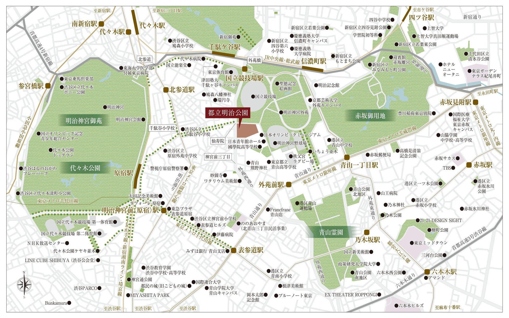都営大江戸線 国立競技場駅:徒歩9分 / 東京メトロ銀座線 外苑前駅:徒歩9分 / JR総武線 千駄ヶ谷駅:徒歩10分 / JR総武線 信濃町駅:徒歩13分