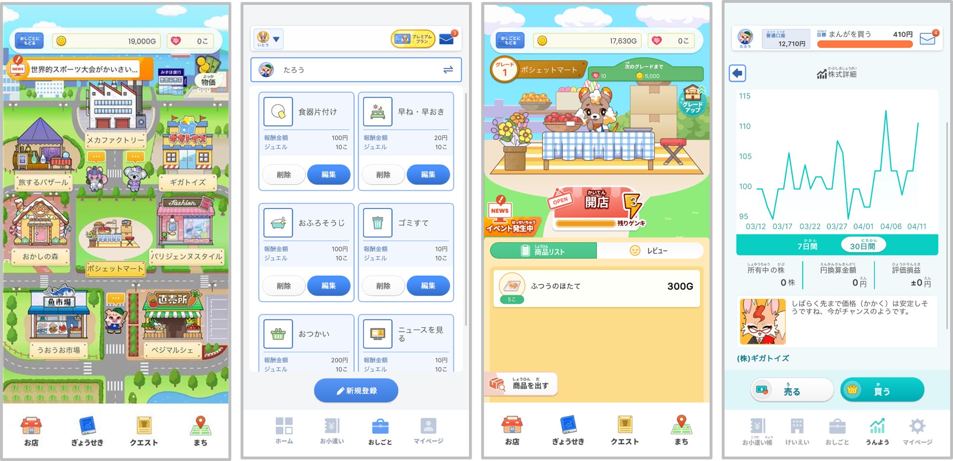 子どもたちはお店の経営をすることで、社会の仕組みを学ぶことができます。お手伝いで得られるジュエルがないと進まない設定が一部あり、経営を続けたい場合はお手伝いに戻る(=親子の会話を発生させる)工夫をしています。また、実際の企業も登場することで、現実の社会への理解も進みます。 |