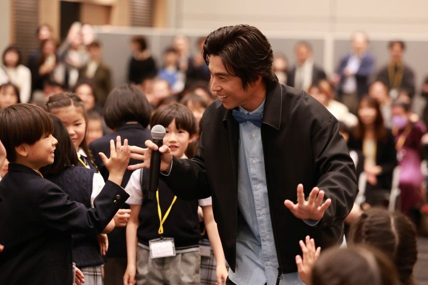 みずほポシェット小原社長の掛け声で始まった 「みずほポシェットスペシャル教室」。すると「今日は特別ゲストが来てくれるんです!」と小学生たちに呼びかける小原社長。一気に期待感が高まる会場に特別ゲストとして呼び込まれたのはなんと俳優の中尾明慶さん。思いがけないゲストの登場に子どもたちは大盛り上がり。子どもたちとハイタッチをしながら登場した中尾さんはステージに上がると「みんなが近づいてきてくれて嬉しい。今日はよろしくお願いします!」と明るく子どもたちに挨拶しました。