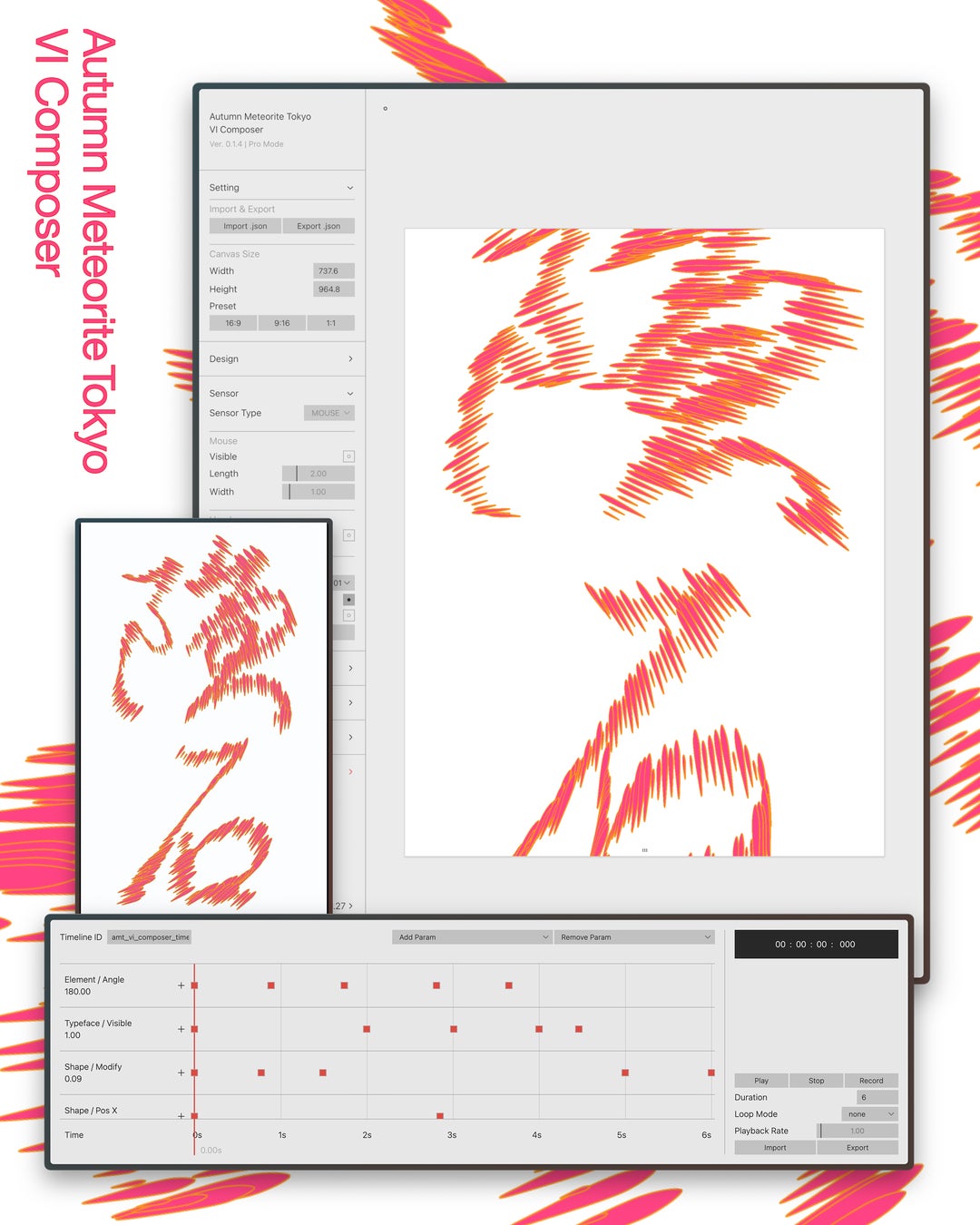「秋の隕石」という名前は思いがけないものだったが、力のある強い字面だと感じた。そのまま素直にロゴタイプを作ればビジュアルコミュニケーション上は十分だったが、VIシステム自体が、岡田氏が掲げる「隕石(ここにないなにか。慣れ親しみのあるものとは大いに異なるなにか。)」になっているべきだと考えた。そこでLive Performing Artsらしく「LIVE VI」なる概念を到来させた。「LIVE VI」とは何か。それは決まった一つの形状だけでなく、規定の動きを続けるモーションだけでもない、刻一刻と形を変えていくVIである。このVIシステムを成り立たせるため様々なセンサーやパラメーターを搭載したジェネレーターを開発した。プリセット機能によって一般的なアセット管理の感覚で使用することもできるが、出力されるデザインには必ず乱数が使われるため二度と同じものは作ることができない。僕たちはこの「隕石」を受け入れることができるだろうか。