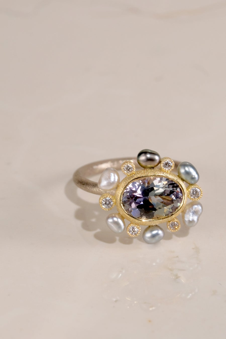 様々な要素が集まり「1つ」になるイメージでデザインされたシリーズ。バンで世界を巡り、スリランカの自社工場で研磨を手掛けるアメリカの宝石商から仕入れたタンザナイトは、加熱処理をされていない、極めて希少な逸品。非加熱ゆえの淡いニュアンスのクラデーションカラーが大変美しいリング。