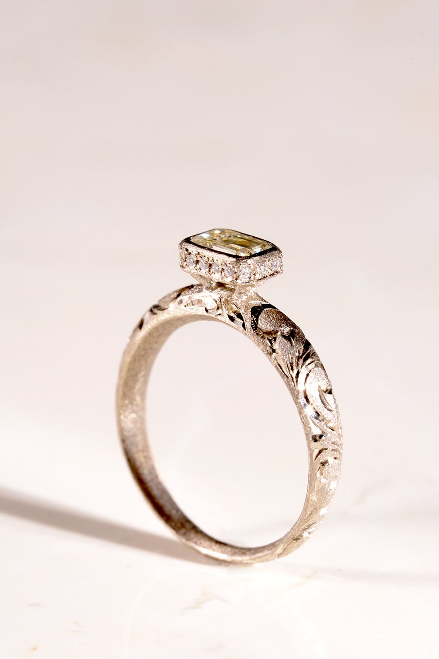 孤を描いたボディに彫り込んだのは、古典的な唐草模様を現代的に昇華させた、オリジナルのアラベスク柄です。ダイヤモンドは透明度の高いVSクラリティのものを使用。時が経つにつれてホワイトゴールドがスモーキーに変化し、味わいのある風合いへ育っていく、SIXTH NIGHTを代表する作品です。