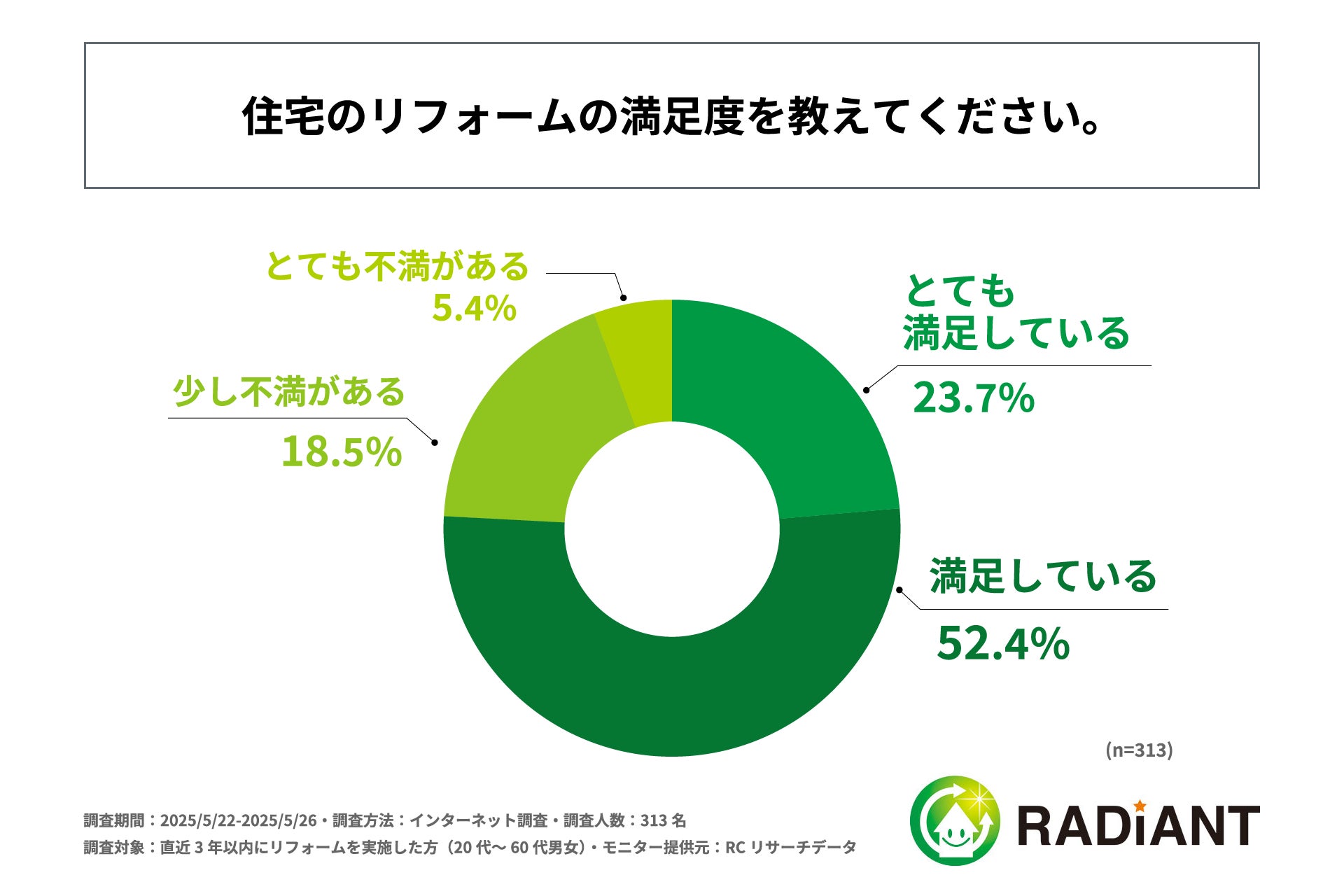 近年、住宅のリフォーム需要が高まるなか、それに便乗した悪徳業者による詐欺的な手口が各地で問題となっています。2024年に摘発された悪質リフォーム業者による事件は過去最多を記録し、その多くが「無料点検」などを口実に住民宅へ入り込み、不要な工事を勧めて高額請求を行うといった悪質なものでした。とくに高齢者を狙った訪問販売型の詐欺が相次いでおり、社会的な課題として注目を集めています。こうした背景から、住宅のリフォームにおいて「信頼できる業者選び」がますます重要になっています。しかし、リフォームは人生の中でも頻度の少ない経験であるため、多くの人が「どこで情報を集め、何を基準に業者を選べばいいのか」に悩みながら判断しているのが実情です。では、実際にリフォームを行った人たちはどのような基準で業者を選んだのでしょうか。そこで今回、株式会社ラディエントは、直近3年以内に住宅のリフォームを実施した人を対象に、「住宅リフォームの業者選び」に関する実態調査を実施しました。
