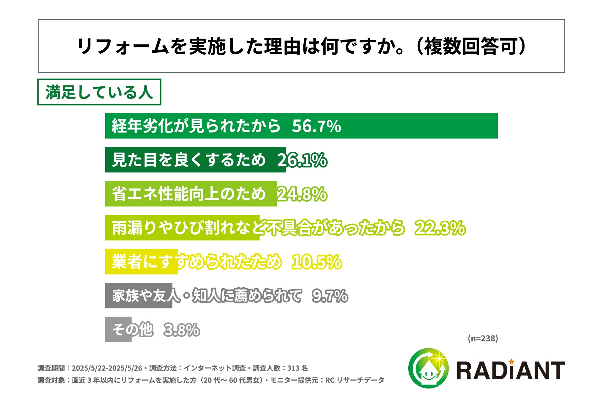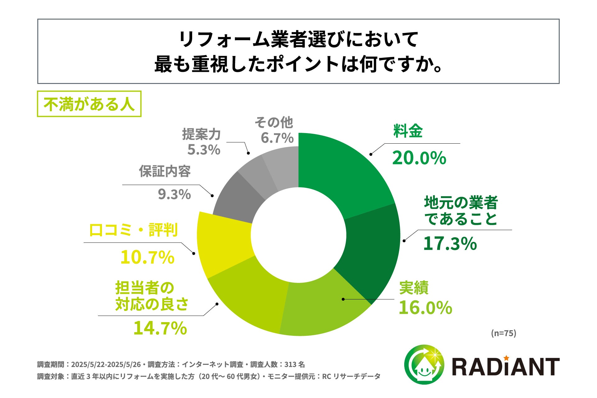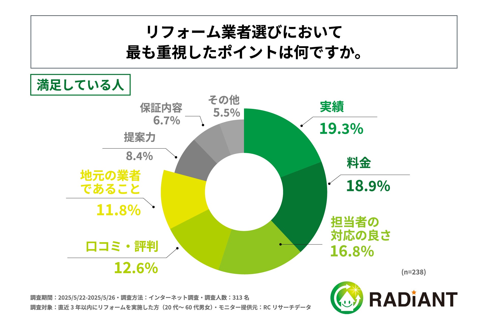 リフォーム業者選びで最も重視したポイント、住宅リフォームの結果に満足している人は「実績」を重視、不満がある人は「料金」を重視!株式会社ラディエントが「住宅リフォームの業者選び」に関する実態調査を実施!
