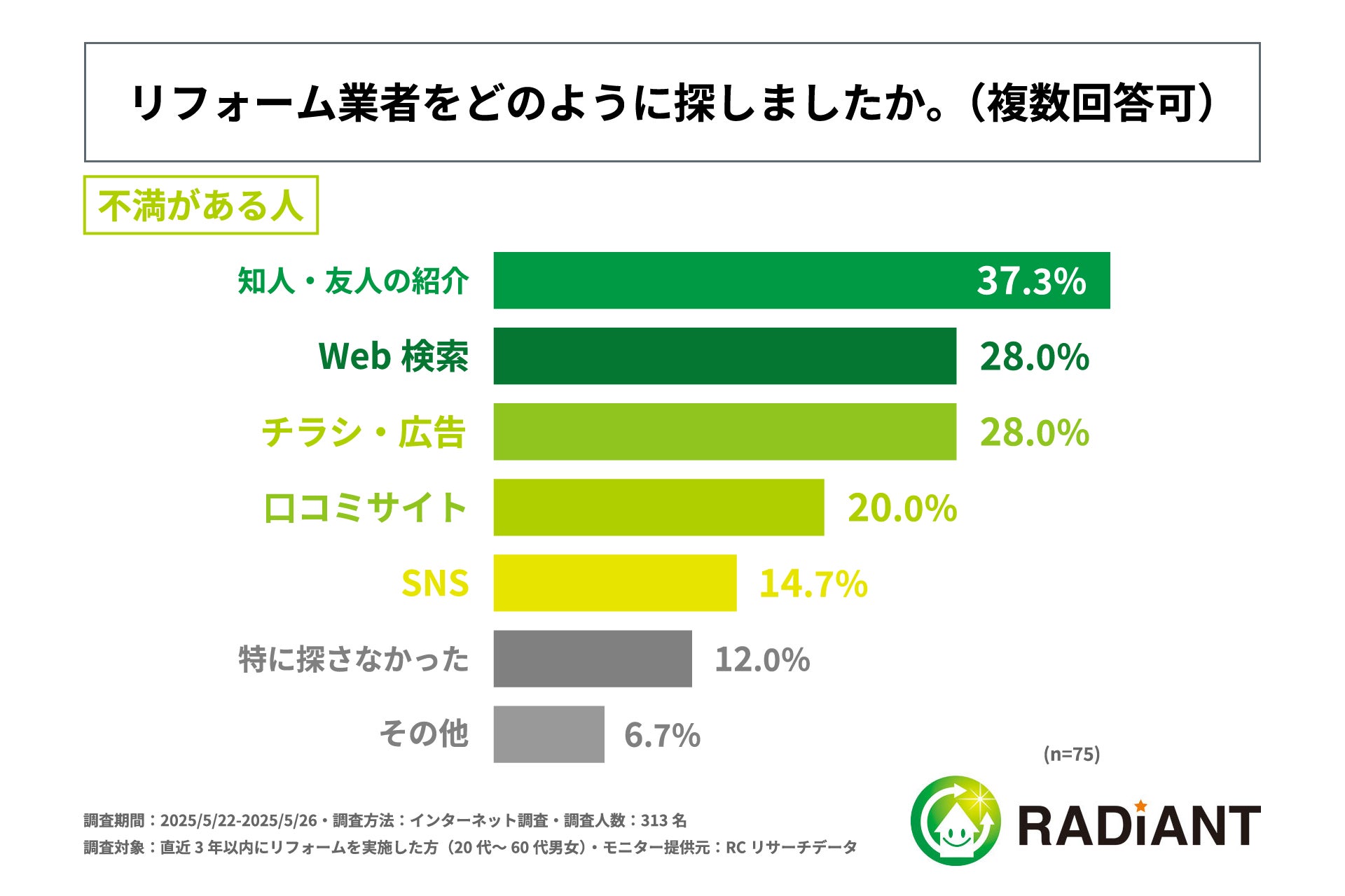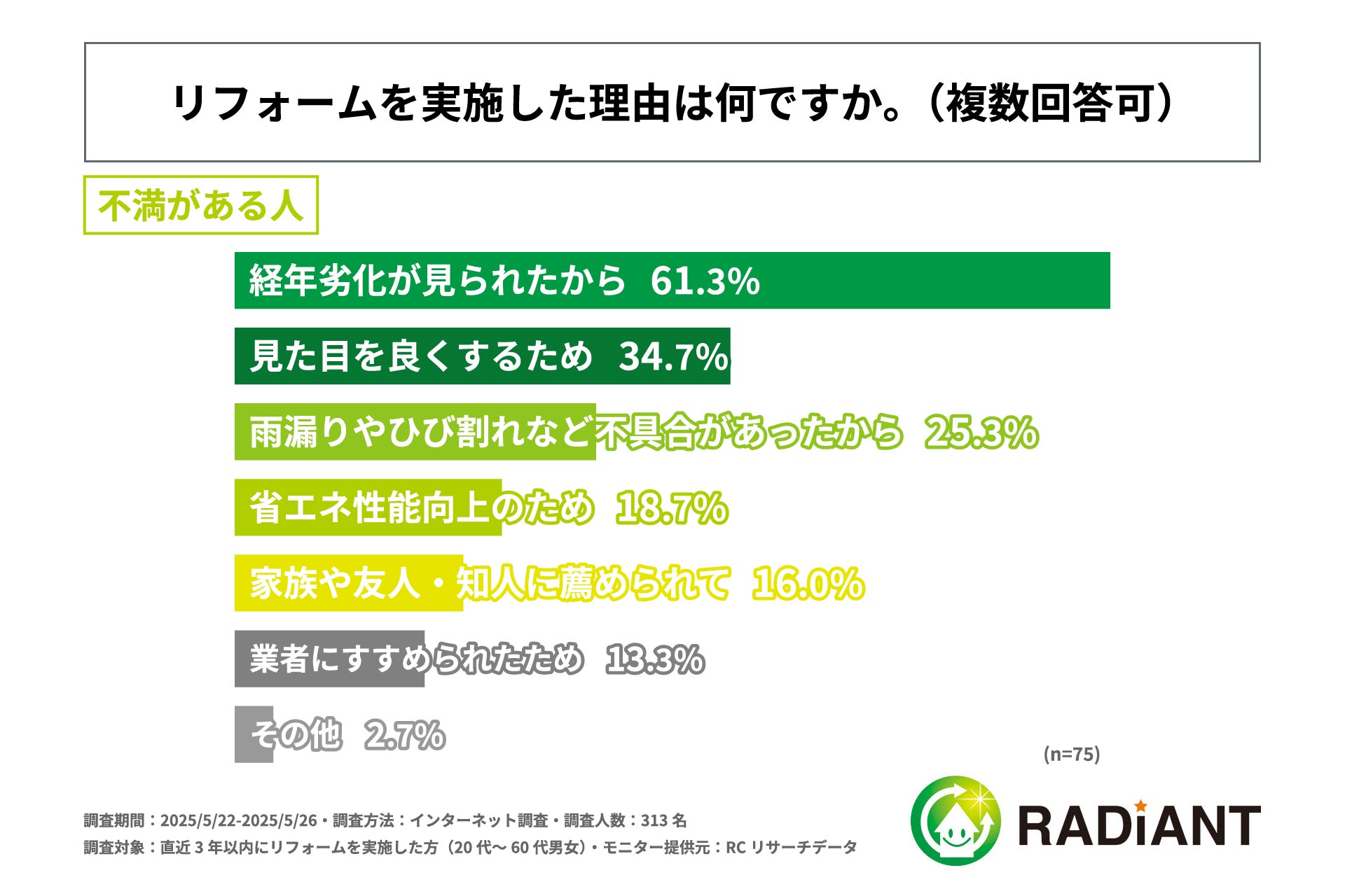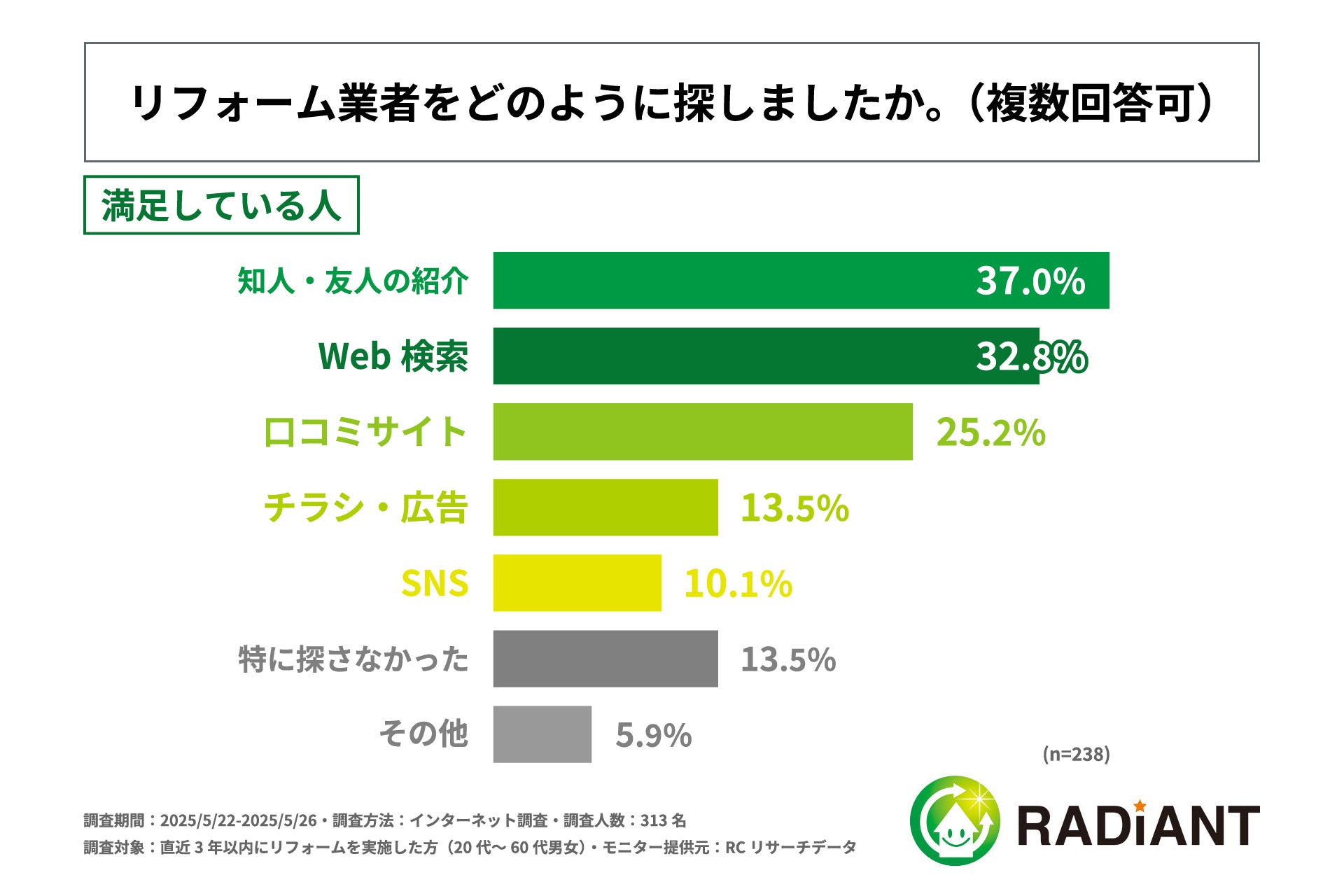 リフォーム業者選びで最も重視したポイント、住宅リフォームの結果に満足している人は「実績」を重視、不満がある人は「料金」を重視!株式会社ラディエントが「住宅リフォームの業者選び」に関する実態調査を実施!