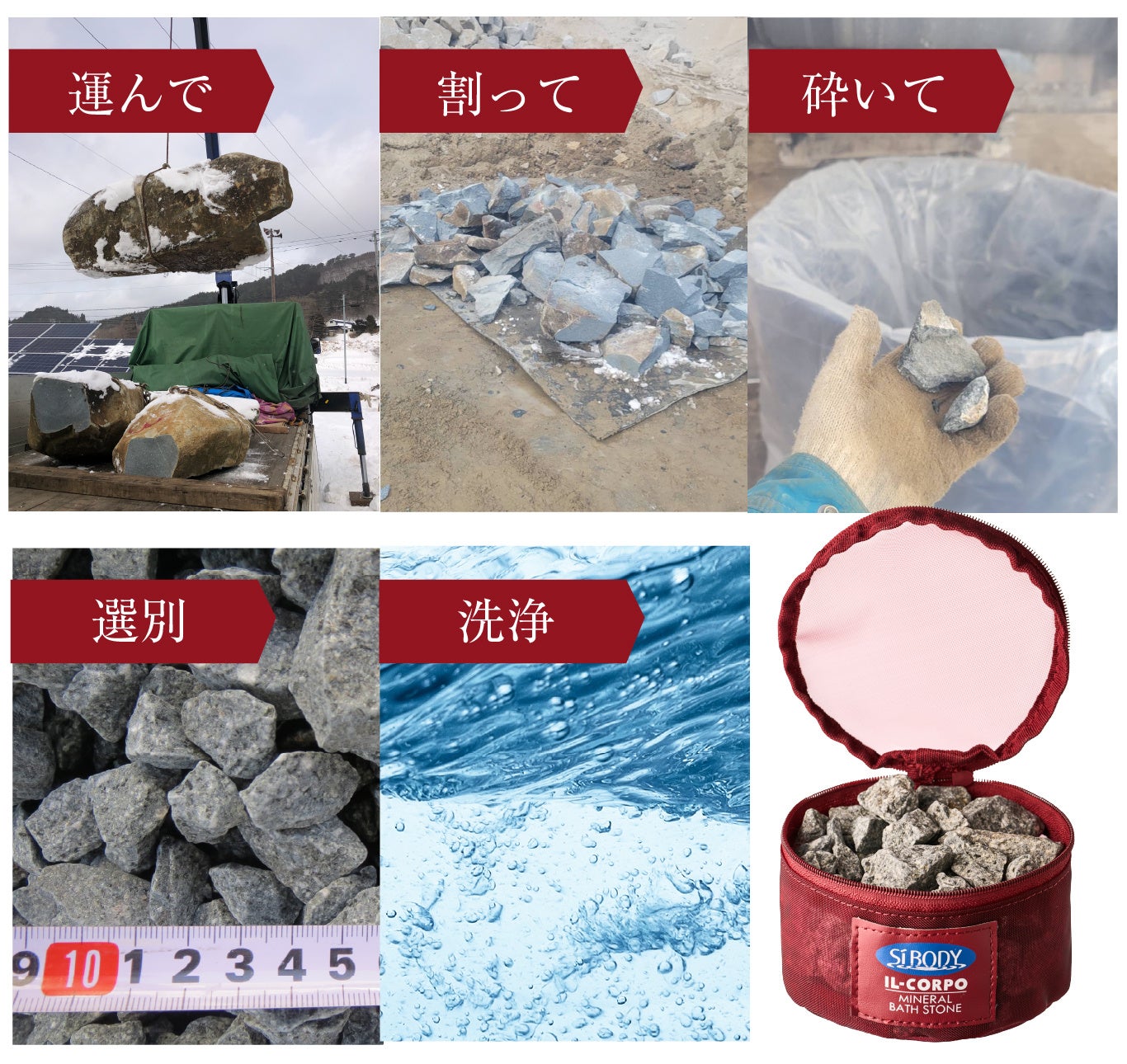 岩手・遠野の自然が育んだ、貴重な角閃石。その原石を山から丁寧に運び出し、割り、砕き、選び抜き、清らかな水で洗い上げる。