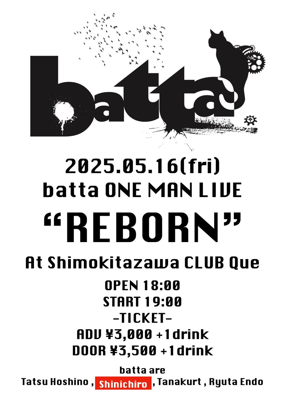 2025年5月16日、2009年結成のロックバンド"batta"が3年半ぶりにバンド編成でのワンマンライブ"REBORN"を開催する。会場は今までもワンマンライブを数回開催してきた下北沢CLUB Que。