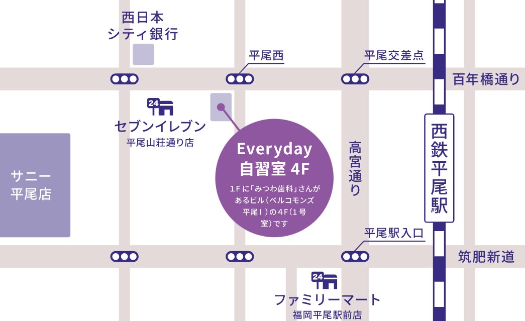 Everyday 自習室は、福岡市中央区平尾という、恵まれたロケーションを活かし、真剣に目標に向かってゴールを目指す方が、その目的を達成し、次のステップへと飛び立つための場所(通過点)を目指しています。お試し利用、初月無料キャンペーンを通じて、ぜひご体験をいただき、快適に集中できる環境を実感してください。皆様のご利用を心よりお待ちしております。
