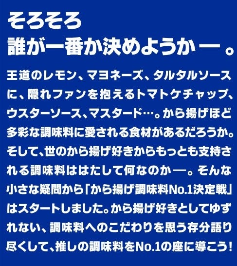 本企画は、「から揚げにかけるとしたら、いちばん相性が良い調味料は何か︖」をテーマに、皆様の投票によってNo.1調味料を決定する参加型イベントです。定番のマヨネーズやレモンはもちろん、意外な調味料やソースも多数エントリー予定。これまでに ありそうでなかった、新しい発⾒があるかもしれません。あなたの“推し調味料”は何位にランクインするのか︖ぜひX上で熱い議論や応援をお楽しみください。さらに特に熱い応援をしてくださった⽅の中から抽選で50名様に素敵な景品をプレゼントします︕皆さまの参加をお待ちしています︕
