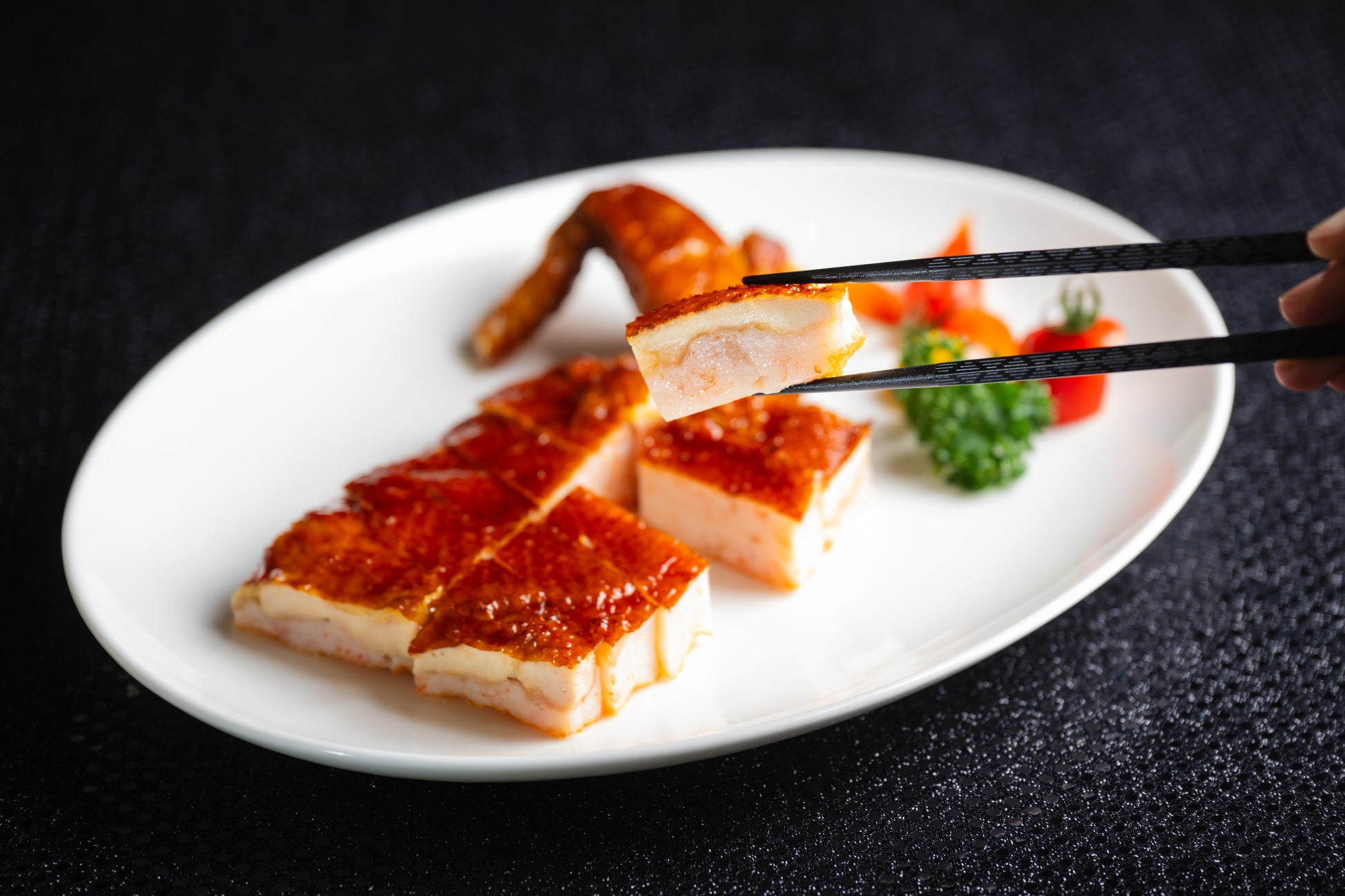 ぷりっとした食感のエビと鶏のすり身を鶏肉で包み、熱々の油を何度もかけて揚げることで、皮を黄金色にパリッと仕上げた贅沢な一皿。