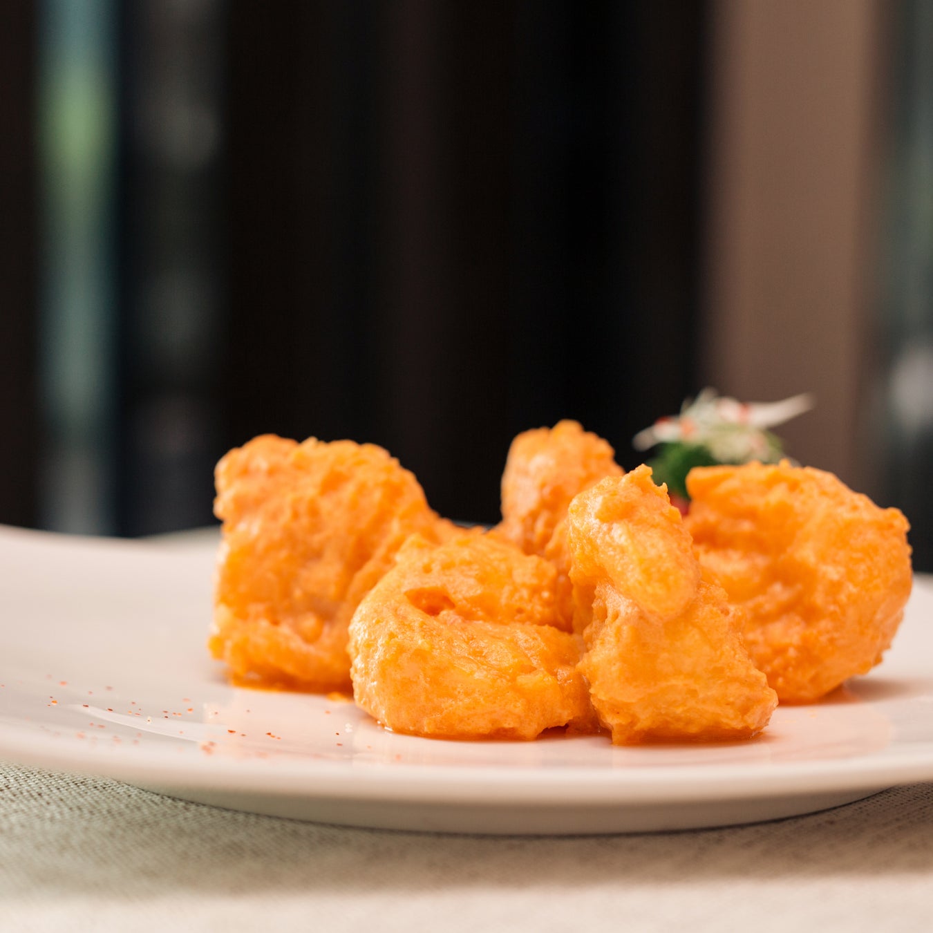サクサクに揚げた海老に、濃厚な塩卵黄のソースをまとわせた贅沢な一皿。