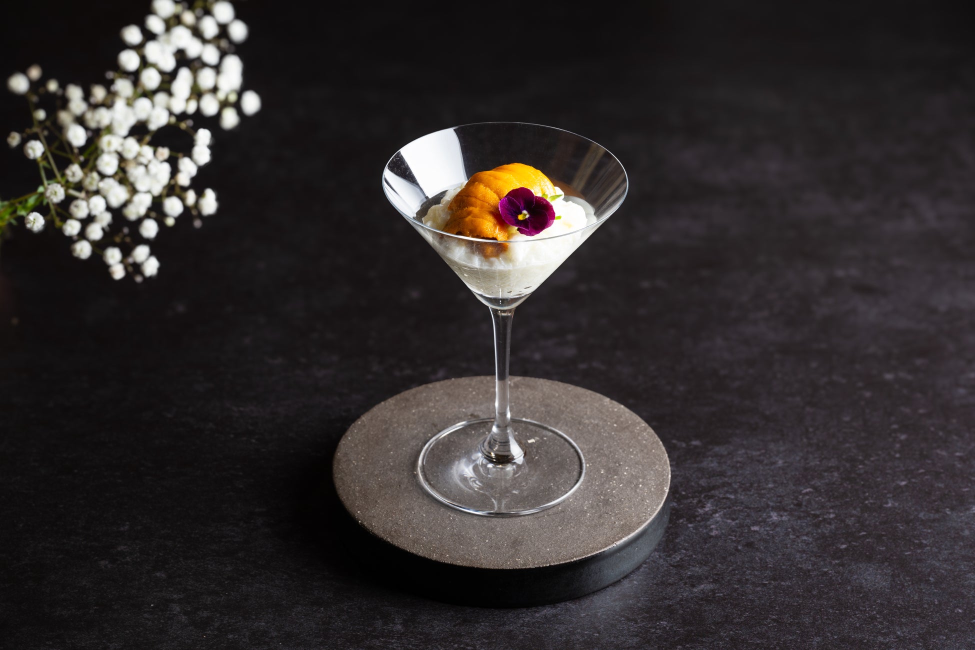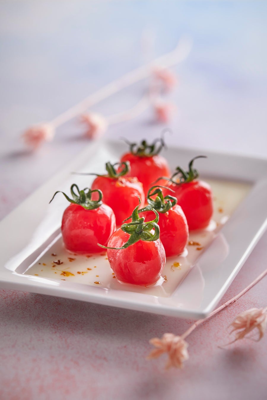 繊細に湯むきされたミニトマトに、花のような香りを纏う金木犀(キンモクセイ)シロップをかけた、爽やかな一品。