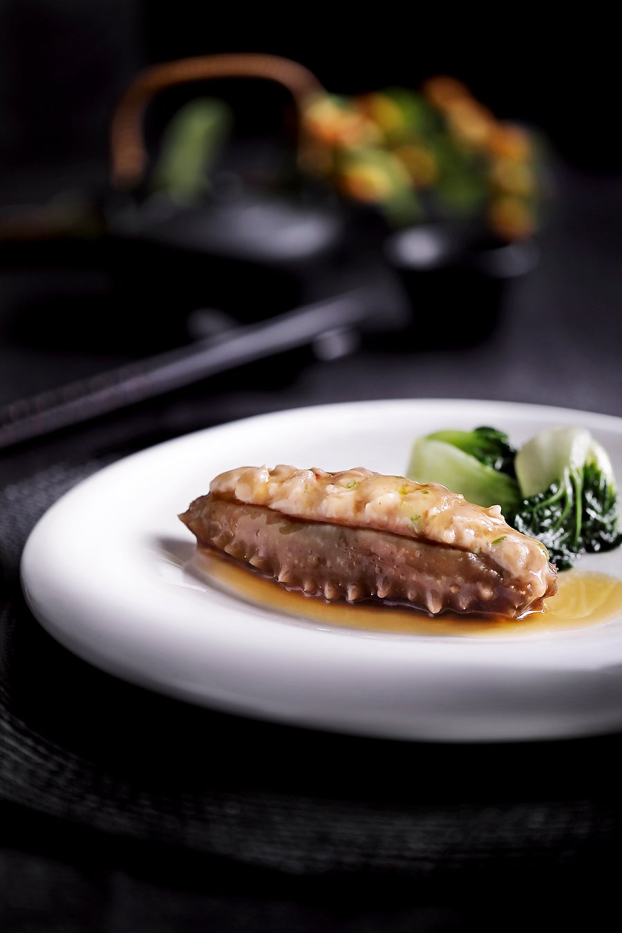 絹のようにやわらかなナマコを丁寧に煮込み、繊細な豚ひき肉をたっぷり詰めました。