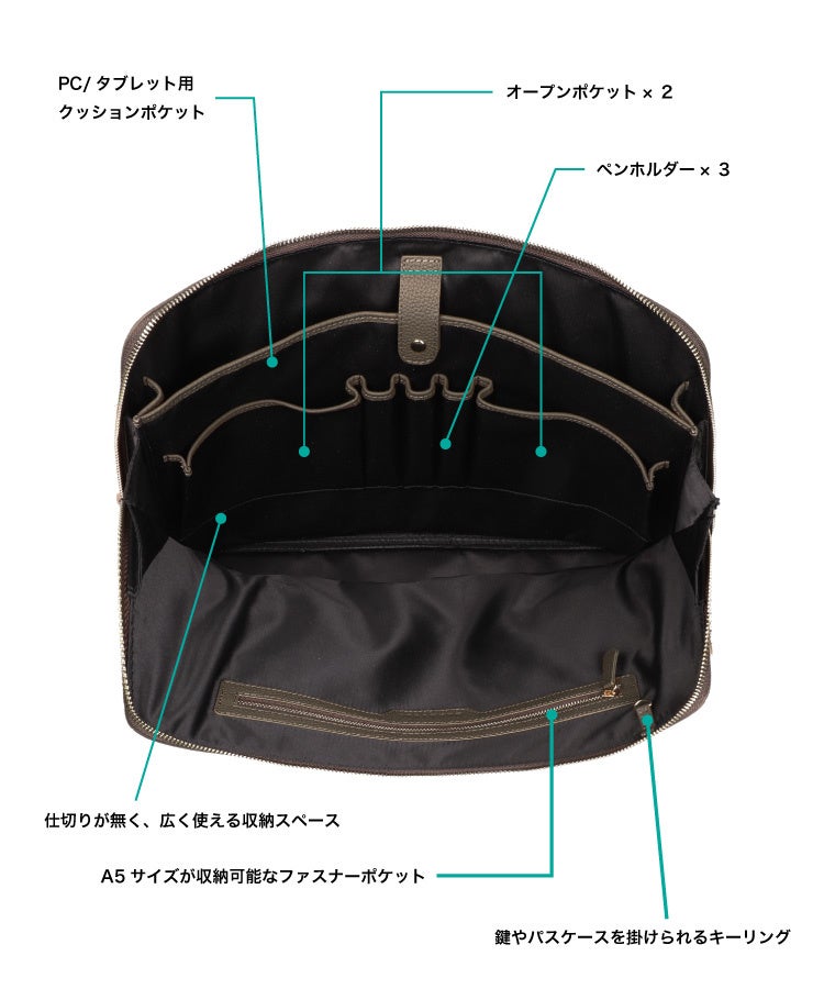縫製の際に底面と側面に[本革と相性の良い厳選した芯材]を埋め込むことで、型崩れがしにくく、中身が少なくても自立する構造となっております。