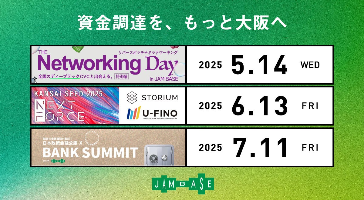グラングリーン大阪のイノベーション拠点JAM BASE(運営組織:一般社団法人コ・クリエーションジェネレーター)は、2025年5月・6月・7月に、全国のVC・CVC・金融機関とスタートアップが直接つながる、大型ネットワーキングイベントを連続開催します。