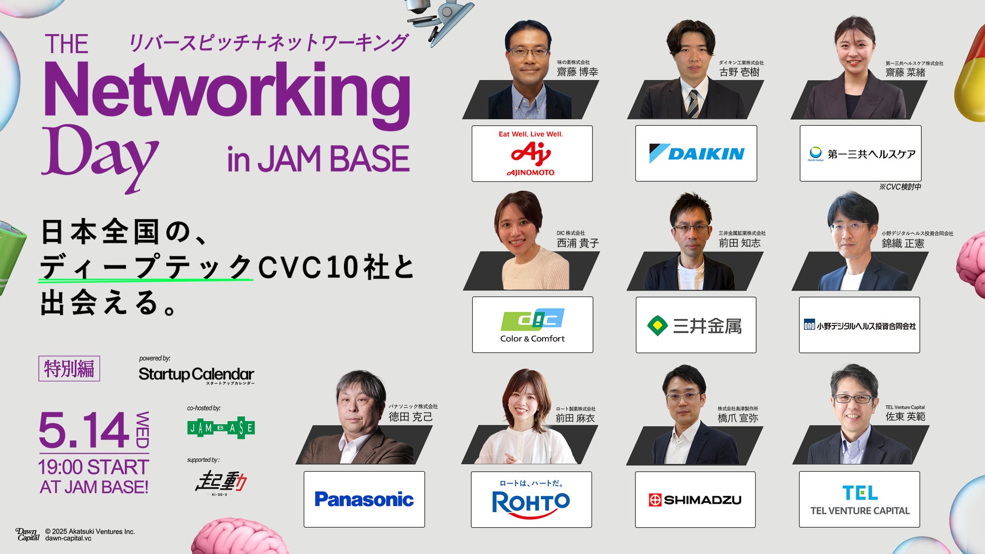 ディープテック領域で注目される全国のCVCがJAM BASEに集結。事業会社とスタートアップの事業共創や投資連携の可能性を探る機会を提供します。CVCによるリバースピッチを実施し、各社の投資基準や今後の投資方針をお話しいただきます。もちろん、ネットワーキングも開催。