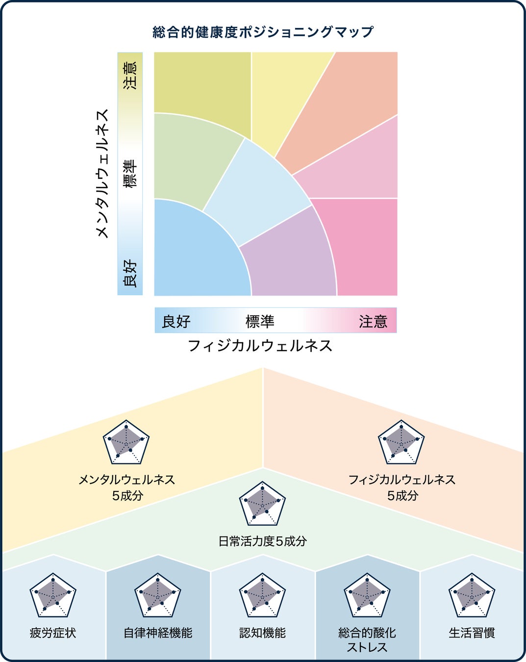 近年、健康経営の重要性が急速に高まる中、企業の従業員の健康を総合的に把握、管理し、職場のパフォーマンスや生産性、エンゲージメントの向上、離職率の抑制を目指す取り組みが求められています。特に、疲労感や倦怠感、認知機能、自律神経機能を包含する日常活力度やメンタルウェルネスが職場のパフォーマンスや生産性に与える影響は大きく、企業の競争力、成長力にも直結すると考えられます。「健康経営検診®」を活用することで、自社の従業員の総合的な健康・未病度を精緻に、定量的に把握し、支援することが可能となり、また部署や役職ごとの分析を行い、対策していくことで健康経営をより強固に進めることが可能となります。