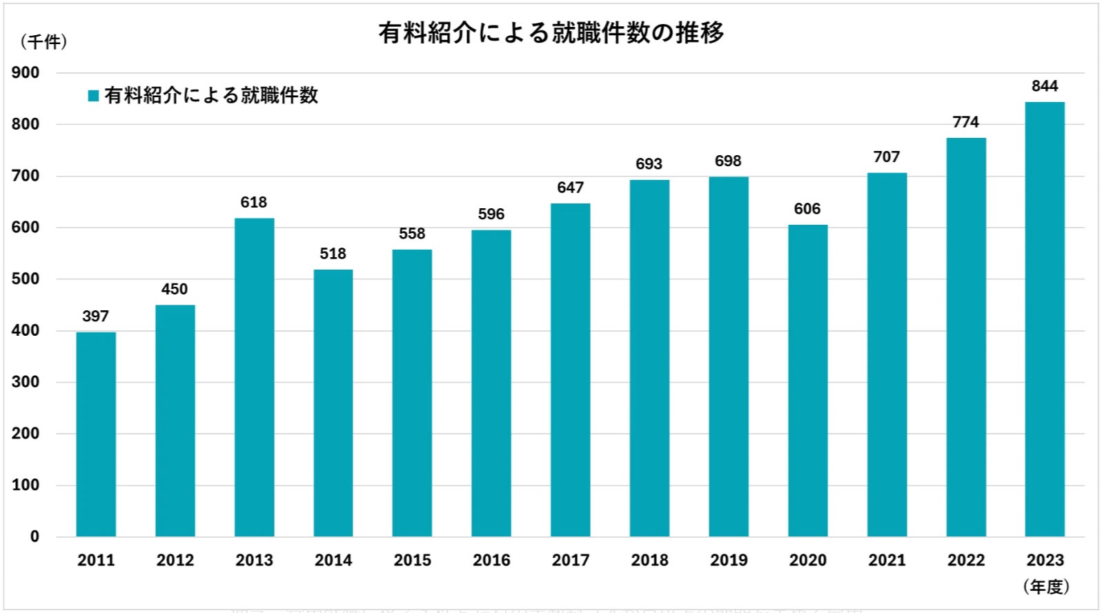 上記グラフのとおり、2011年に397,000件だった有料職業紹介事業者を介した就職件数は、2023年度にはその2倍以上の844,000件まで増加しています。