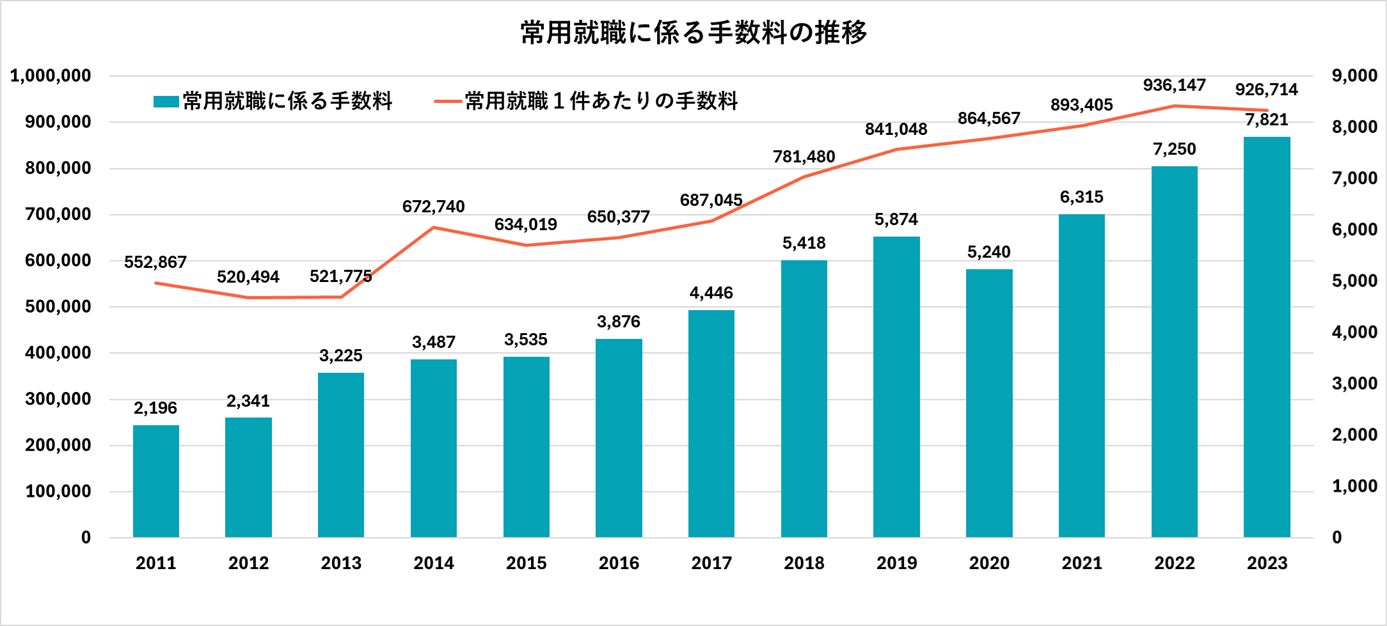 また、同時に常用就職(雇用契約において雇用期間の定めがないか又は4か月以上の雇用期間が定められているもの)に係る1件あたりの手数料も増加傾向です。