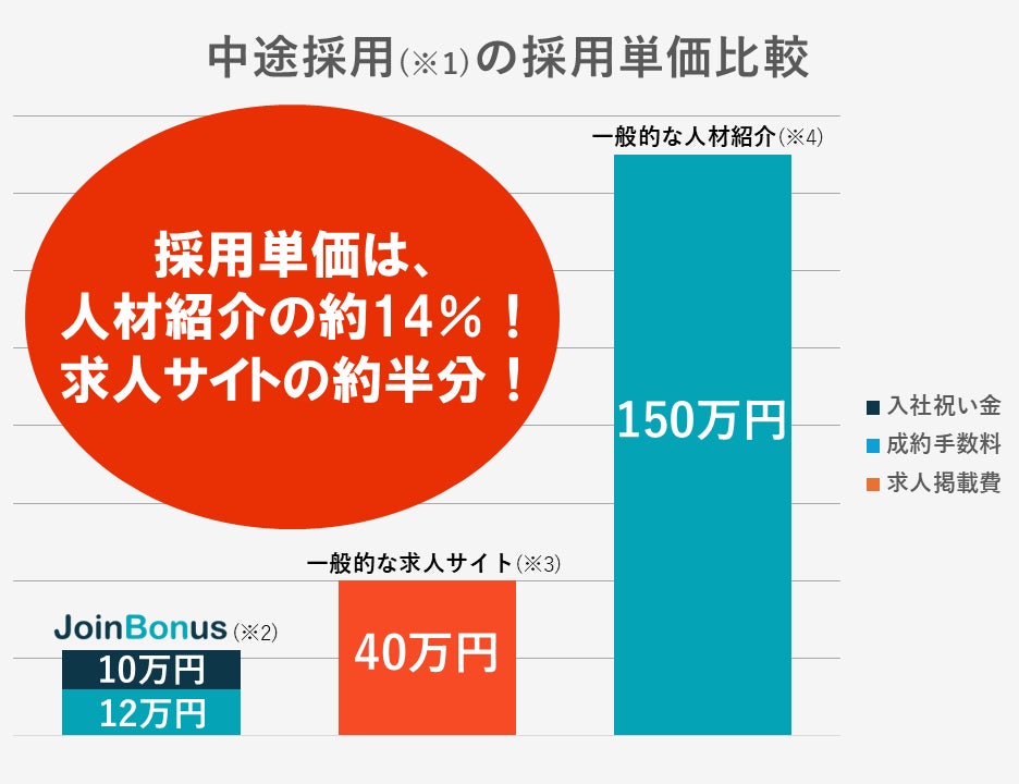 例えば、中途採用の場合に、入社祝い金として100,000円を支給したとしても、ジョインボーナスを利用した場合の採用コストは、一般的な人材紹介の14%、求人サイトの約半分です。