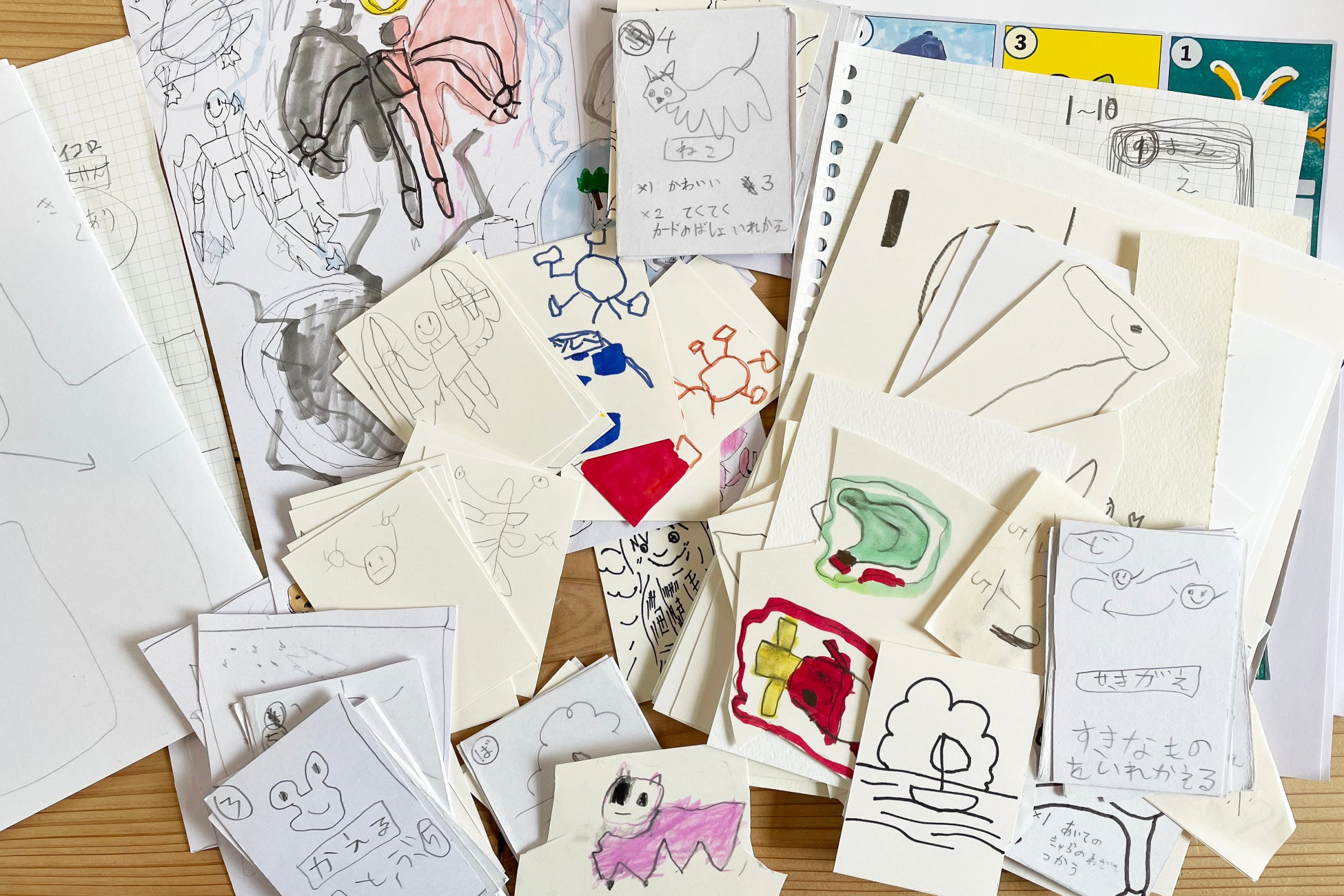 2024年1月、つくじか出版に通う不登校の男の子(当時9歳)から、カードゲームを作りたいと声があがりました。これまでなかなか自分の言葉で意見を発することが難しかった子からの提案でした。まずは作ってみようということで代表の末廣と2人でルールを考えるところから制作をスタートしました。毎日コツコツとカードを考えたり試作を作ってテストプレイをしたりと完成に向けて動き、対戦動画をYouTubeにアップロードもしています。