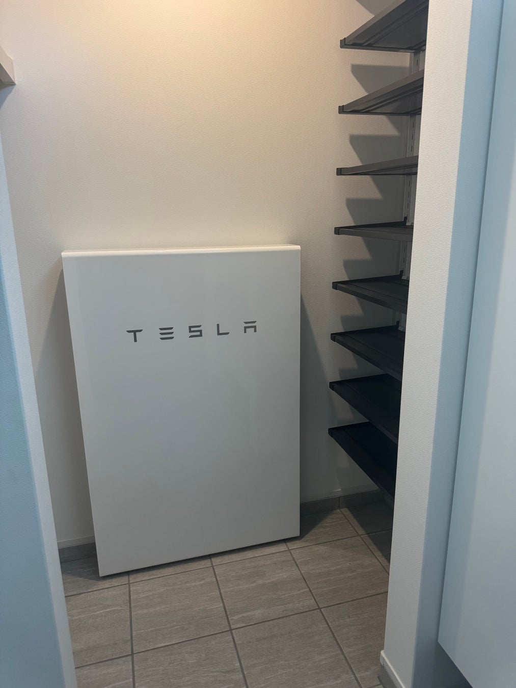 玄関のシューズクローゼット内にはテスラ社の蓄電池「パワーウォール」が設置されている。