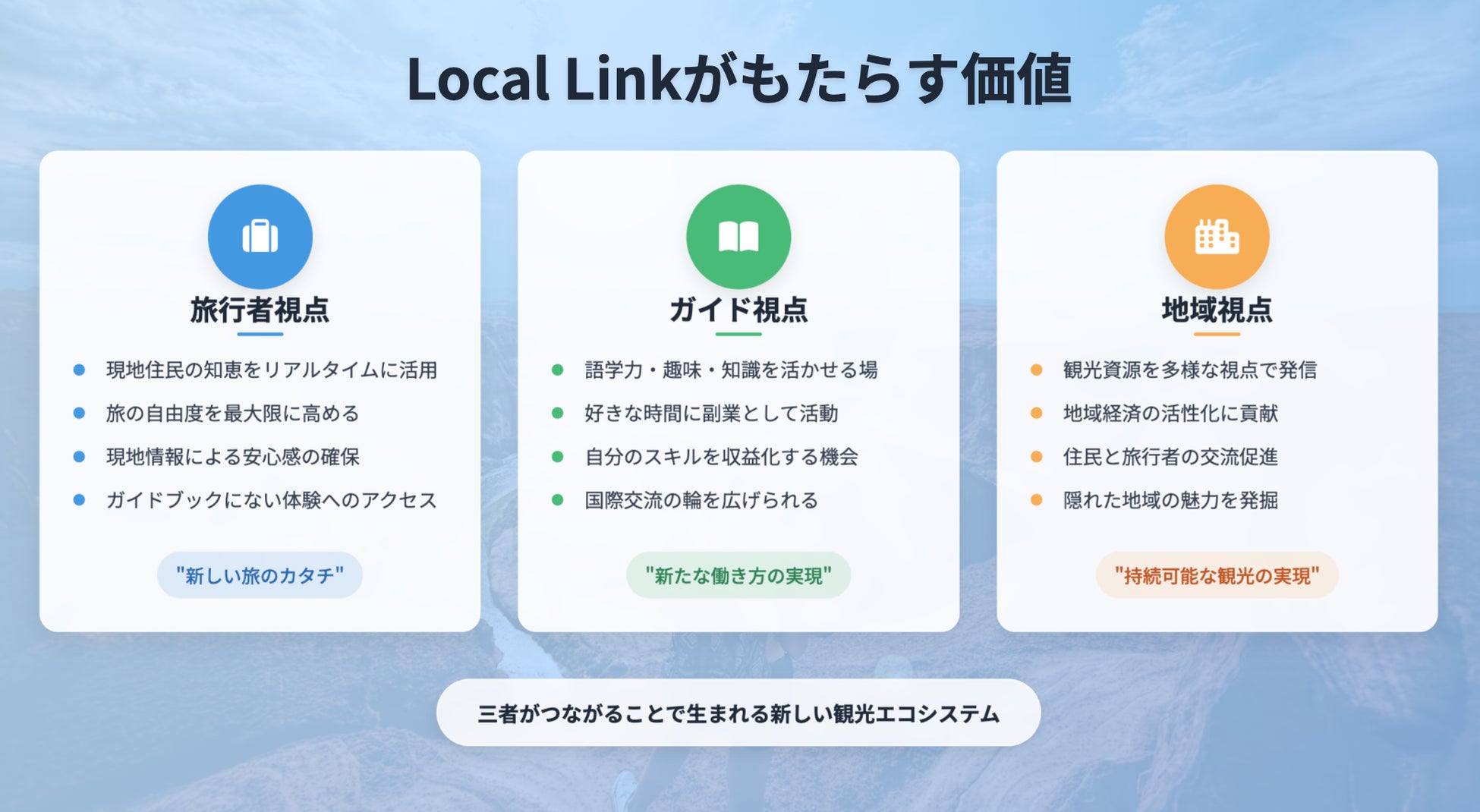 2025年4月1日より株式会社Stonefree https://stonefree.jp (本社:東京都港区、代表取締役:矢野立樹・藤井基生)は、旅行先で“いま”助けがほしい訪日外国人と、語学力を持つ地域のローカルガイドを瞬時につなぐWebプラットフォーム 「Local Link β版」 の提供を開始しました。ローンチから1カ月で登録ガイド数100名を突破し、東京23区を中心にリアルタイム観光サポートの新常識を創出していきます。