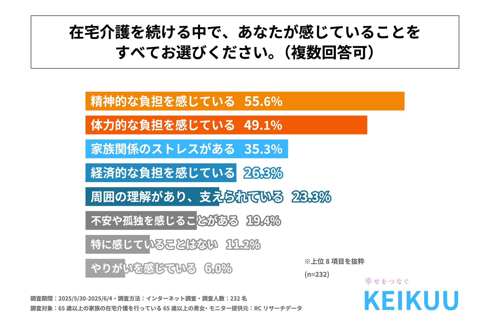 次に、「在宅介護を続ける中で、感じていること」を尋ねる設問への回答では、1位が「精神的な負担を感じている」で55.6%、2位が「体力的な負担を感じている」で49.1%、3位が「家族関係のストレスがある」で35.3%という結果になりました。この結果から、在宅介護を続ける中で主に感じていることは、「精神的な負担」と「体力的な負担」であることがわかりました。