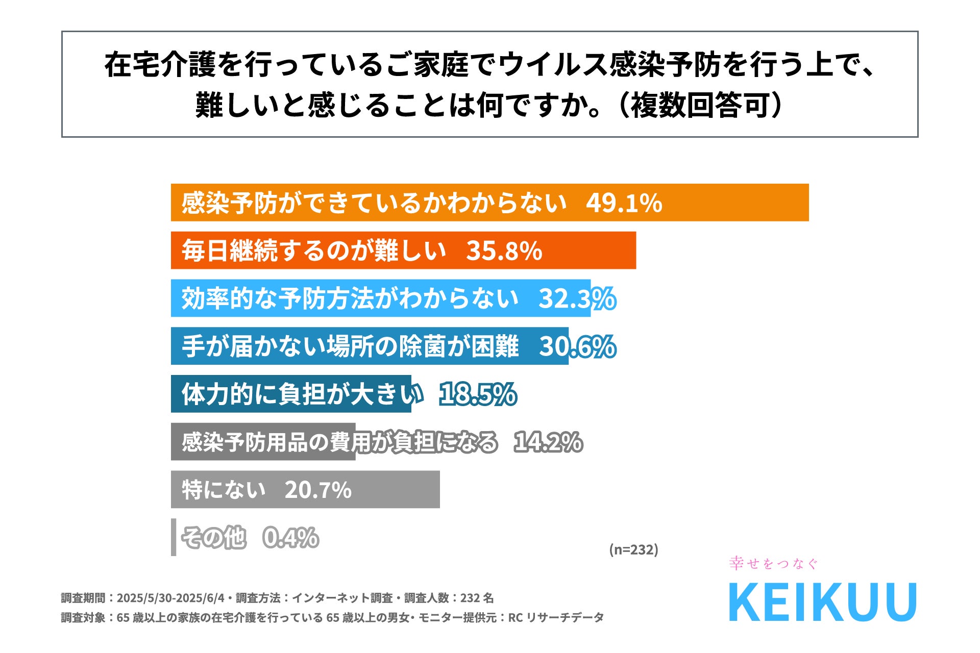 次に、「在宅介護をしている家庭でウイルス感染予防を行う上で、難しいと感じること」を尋ねる設問への回答では、1位が「感染予防ができているかわからない」で49.1%、2位が「毎日継続するのが難しい」で35.8%、3位が「効率的な予防方法がわからない」で32.3%という結果になりました。この結果から、在宅介護をしている家庭でウイルス感染予防を行う上で、主に難しいと感じるのは、「感染予防ができているかわからないこと」や「毎日継続するのが難しいこと」であることがわかりました。