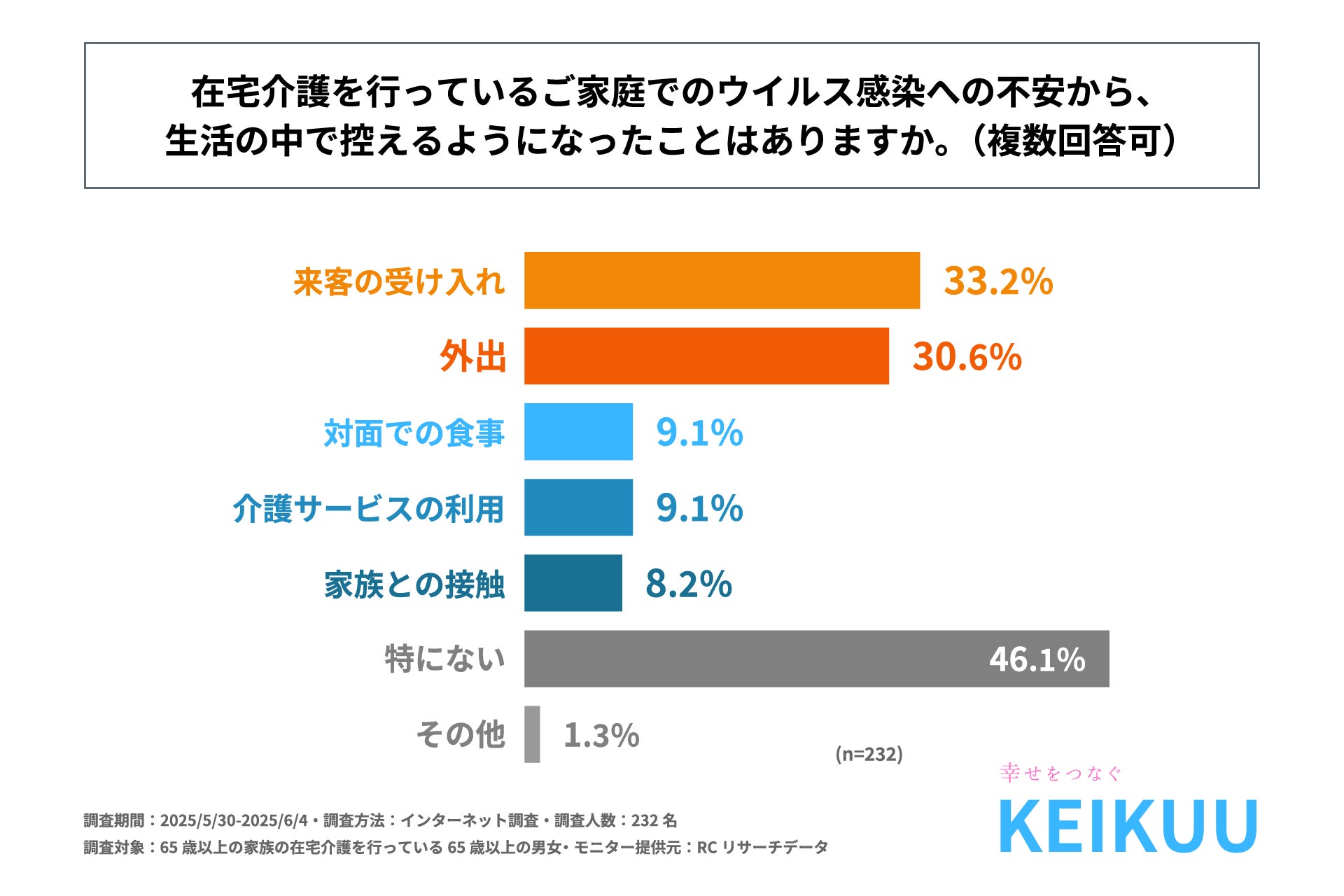 調査の最後、「在宅介護を行っている家庭でウイルス感染への不安から、生活の中で控えるようになったこと」を尋ねる設問への回答では、1位が「特にない」で46.1%、2位が「来客の受け入れ」で33.2%、3位が「外出」で30.6%という結果になりました。この結果から、65歳以上の家族を在宅介護している65歳以上の男女の4割以上が、在宅介護を行っている家庭でウイルス感染への不安から、生活の中で控えるようになったことは「特にない」一方で、「来客の受け入れ」や「外出」を控えるようになった人も一定数いることが明らかになりました。