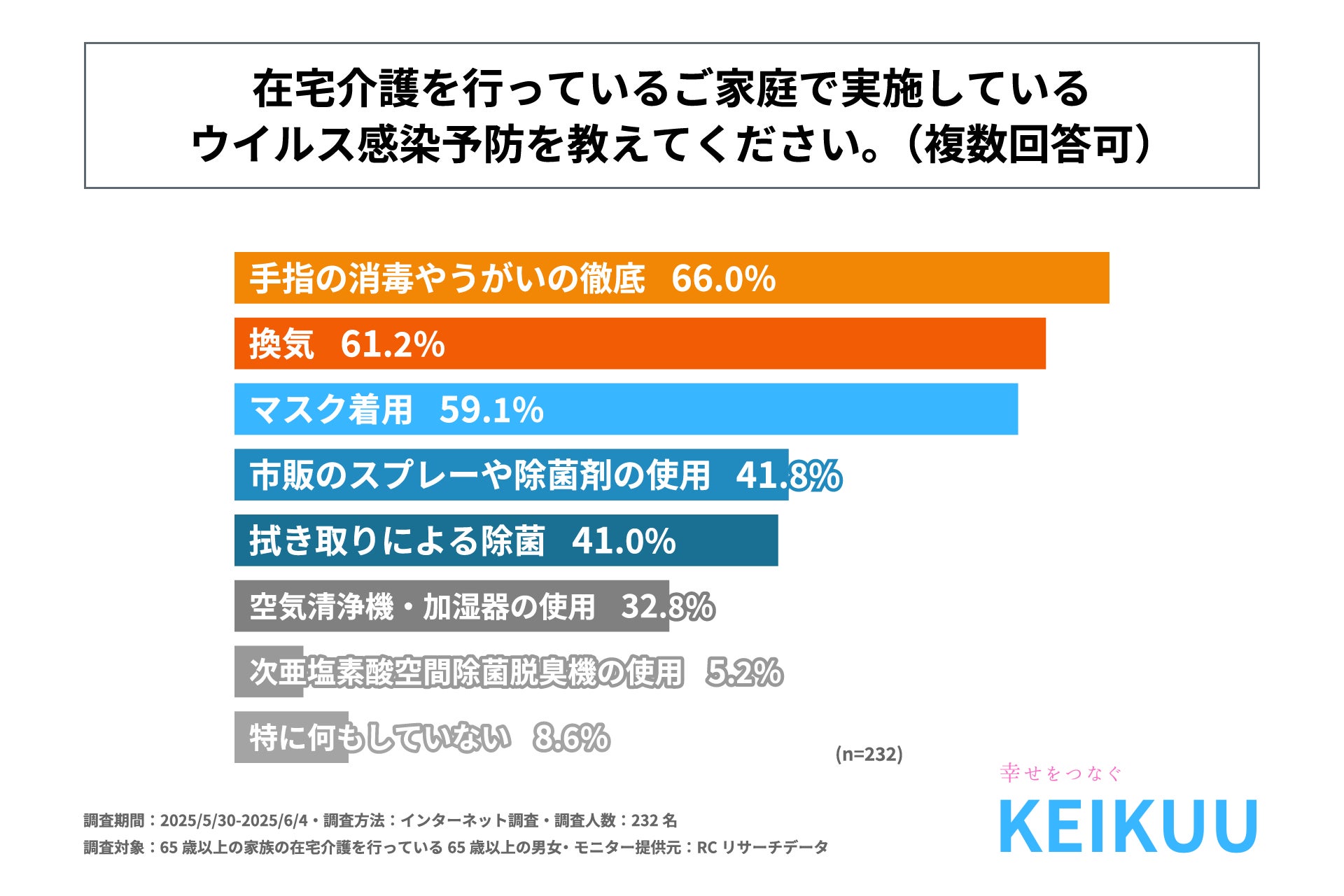また、「在宅介護を行っているご家庭で実施しているウイルス感染予防」を尋ねる設問への回答では、1位が「手指の消毒やうがいの徹底」で66.0%、2位が「換気」で61.2%、3位が「マスク着用」で59.1%という結果になりました。4位以降も回答率30%以上の回答が複数並ぶことから、在宅介護を行っている家庭で実施しているウイルス感染予防は多岐に渡ることが明らかになりました。