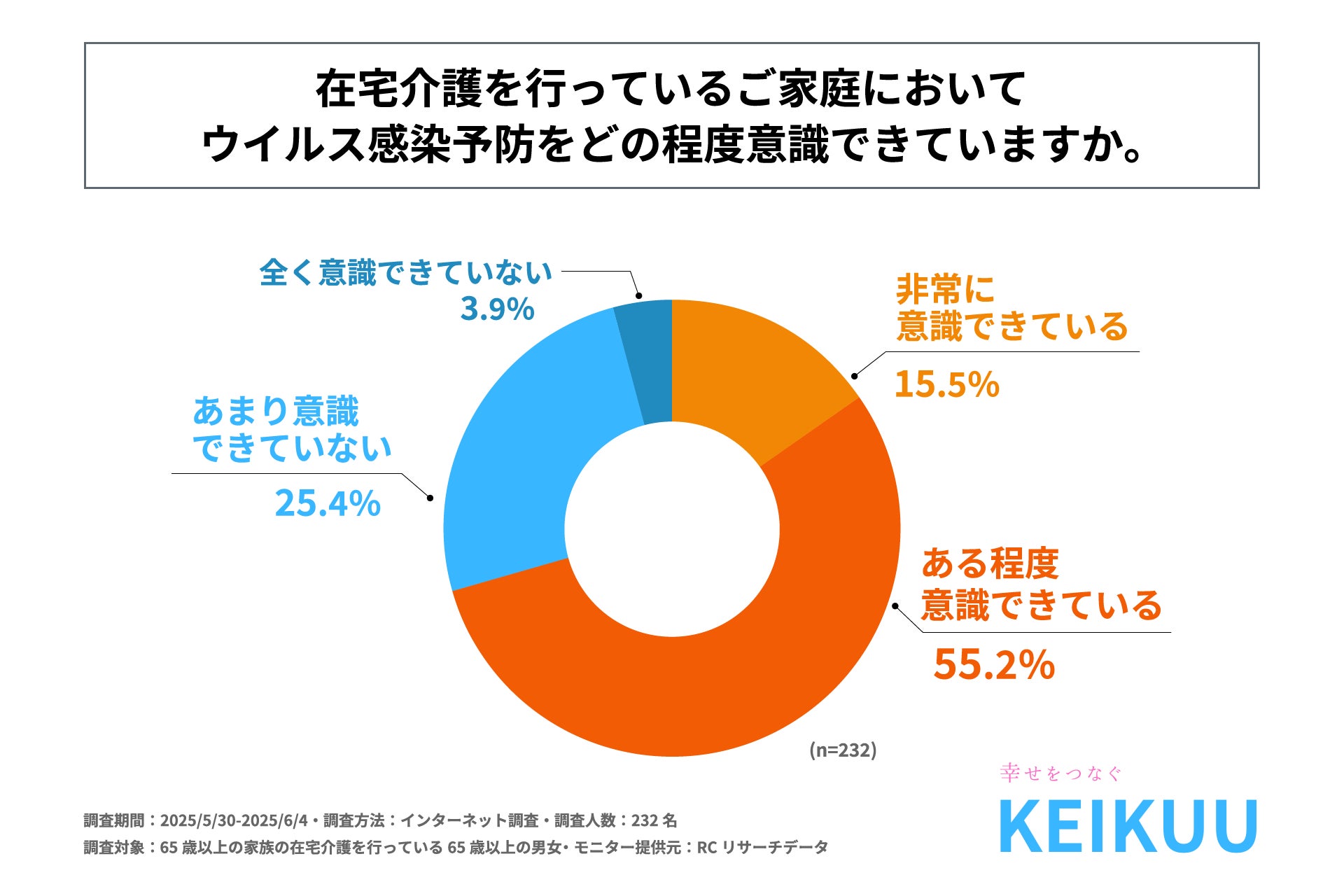 続いて、「在宅介護を行っているご家庭においてウイルス感染予防をどの程度意識できているか」を尋ねる設問への回答では、1位が「ある程度意識できている」で55.2%、2位が「あまり意識できていない」で25.4%、3位が「非常に意識できている」で15.5%、4位が「全く意識できていない」で3.9%という結果になりました。「あまり意識できていない」と「全く意識できていない」の回答を合計すると回答率約30%となり、この結果から、65歳以上の家族を在宅介護している65歳以上の男女の約3割が、在宅介護を行っている家庭で、ウイルス感染予防をあまり意識できていないことが判明しました。