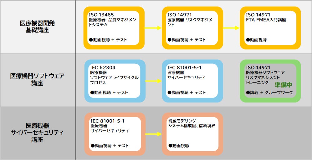 本サービスでは、ソフトウェアライフサイクルプロセス(IEC 62304)、リスクマネジメント(ISO 14971)、品質マネジメント(ISO 13485)など、医療機器開発に不可欠な国際規格への対応支援を提供します。さらに、これらをテーマにした解説動画を無料公開し、教育管理システムを用いた有料の教育管理サービスと連携させ、受講管理・理解度テスト・修了証発行・教育記録レポートを一貫して行える体制を構築しています。