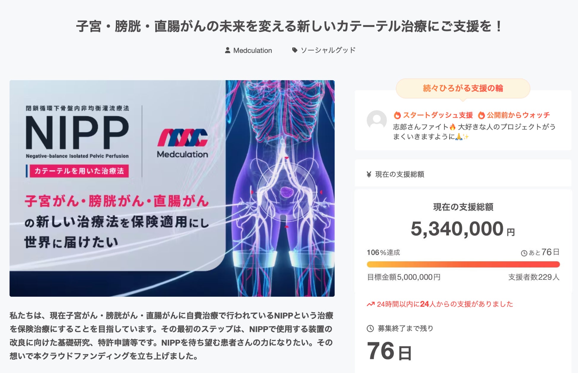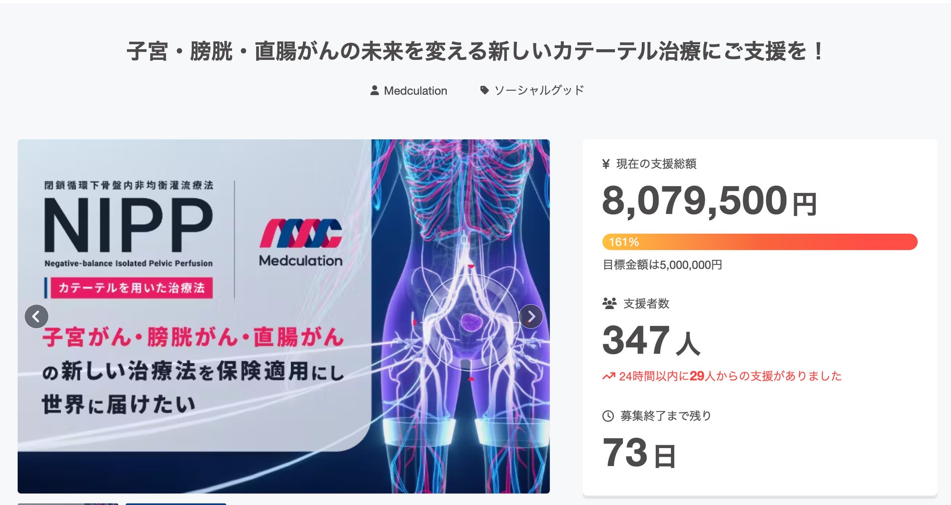 メドキュレーション株式会社(本社:静岡県、代表取締役:柴垣知広)は、子宮がん・膀胱がん・直腸がんに対するカテーテルを用いた治療「NIPP(閉鎖循環下骨盤内非均衡灌流療法)」の保険適用を目指し、2025年5月14日(水)にCAMPFIREで開始したクラウドファンディングにおいて、開始からわずか4日で、229人の支援者により1stゴールの500万円を達成したことをお知らせします。
