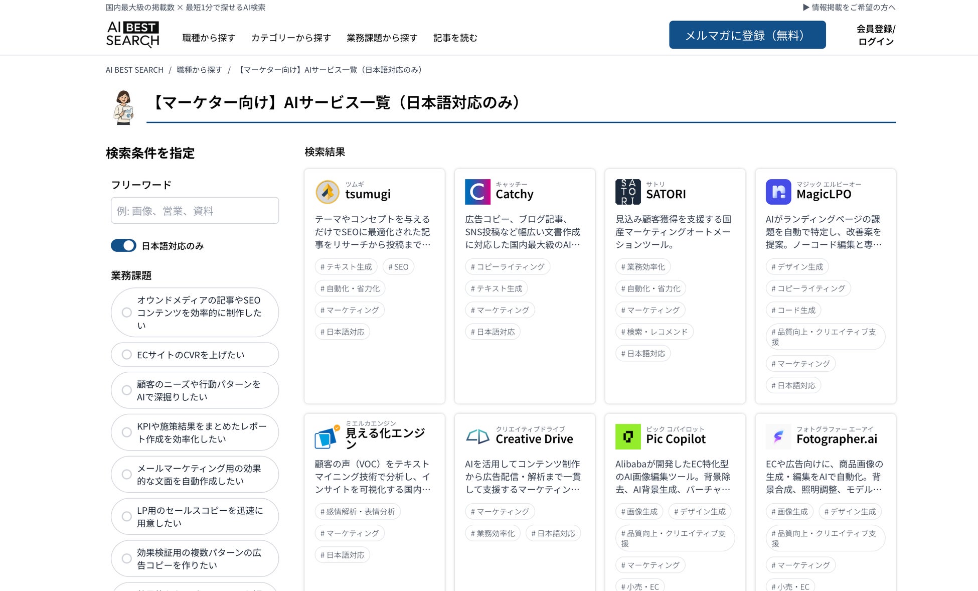 『AI BEST SEARCH( https://ai-best-search.com/ )』は、「目的」「業務課題」「職種」などから最適なAIサービスを最短1分で見つけられる検索・比較プラットフォームです。