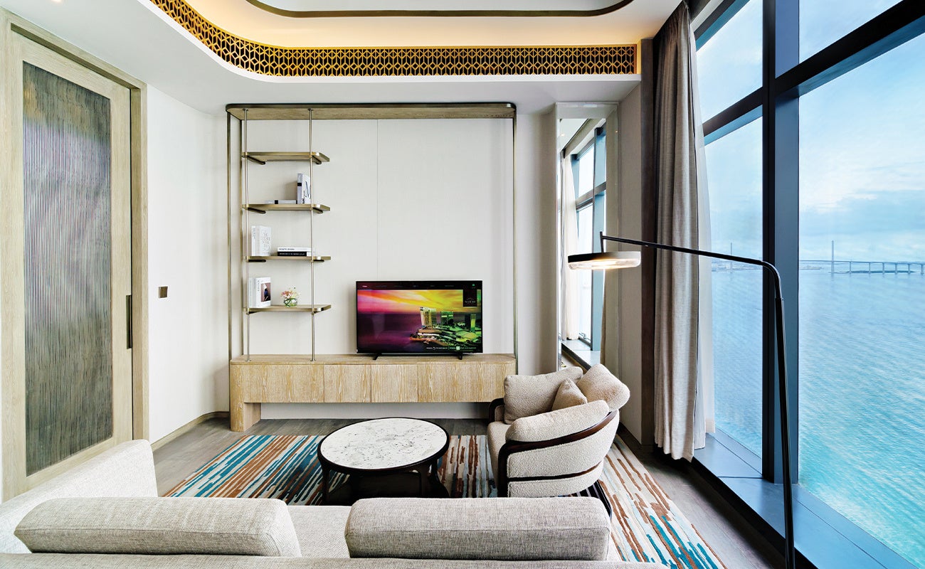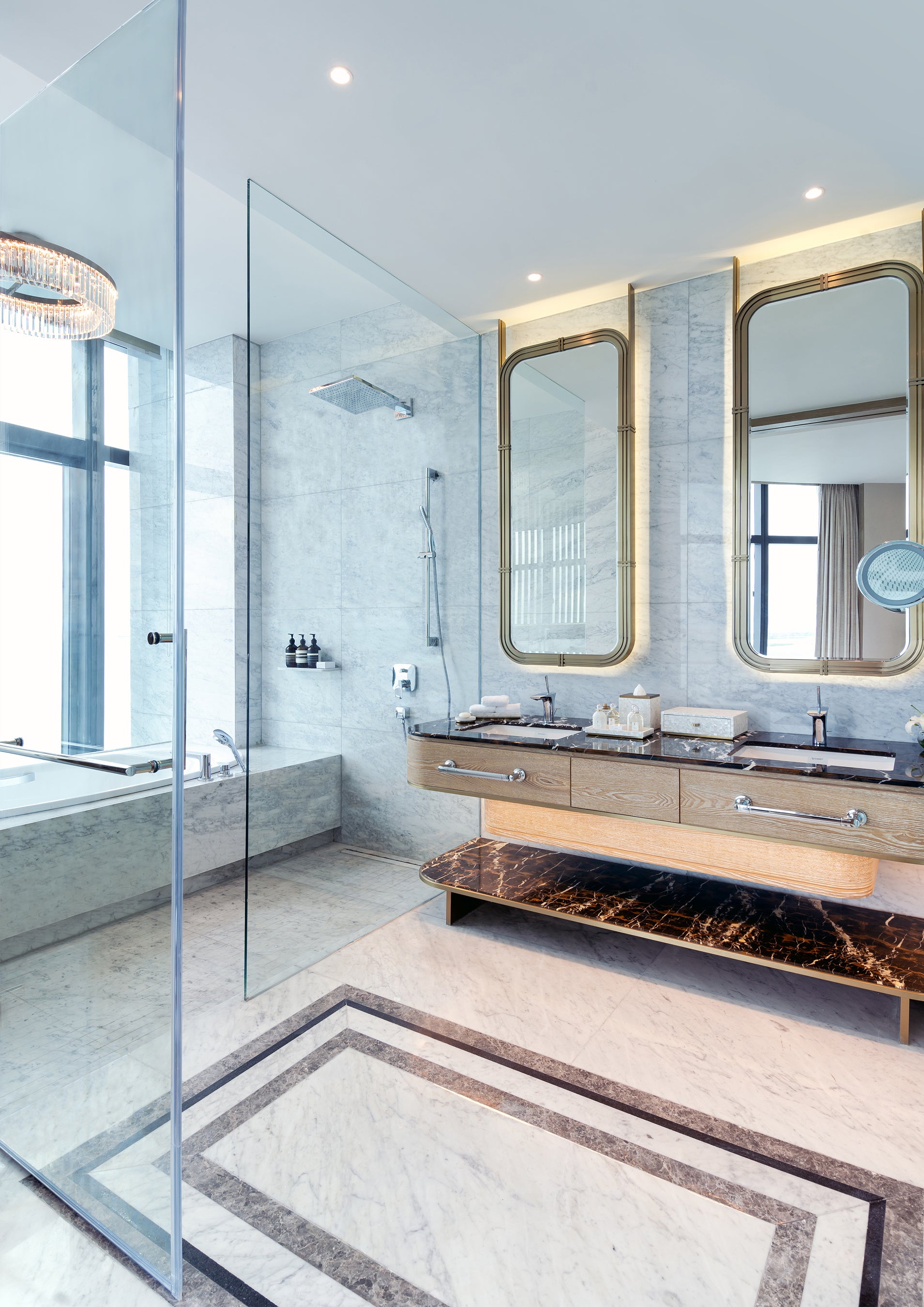 全客室はセブの海や街を一望できる全面窓付き。シグネチャールーム(52㎡〜)およびスイート(77㎡〜225㎡)は、市内最大級の広さを誇り、明るい大理石のバスルーム、ゲラン製アメニティ、最新のインテリジェント設備をご提供します。落ち着いた木材とアースカラーを基調とした内装が、海と夕暮れの色彩と調和し、安らぎの空間を演出します。