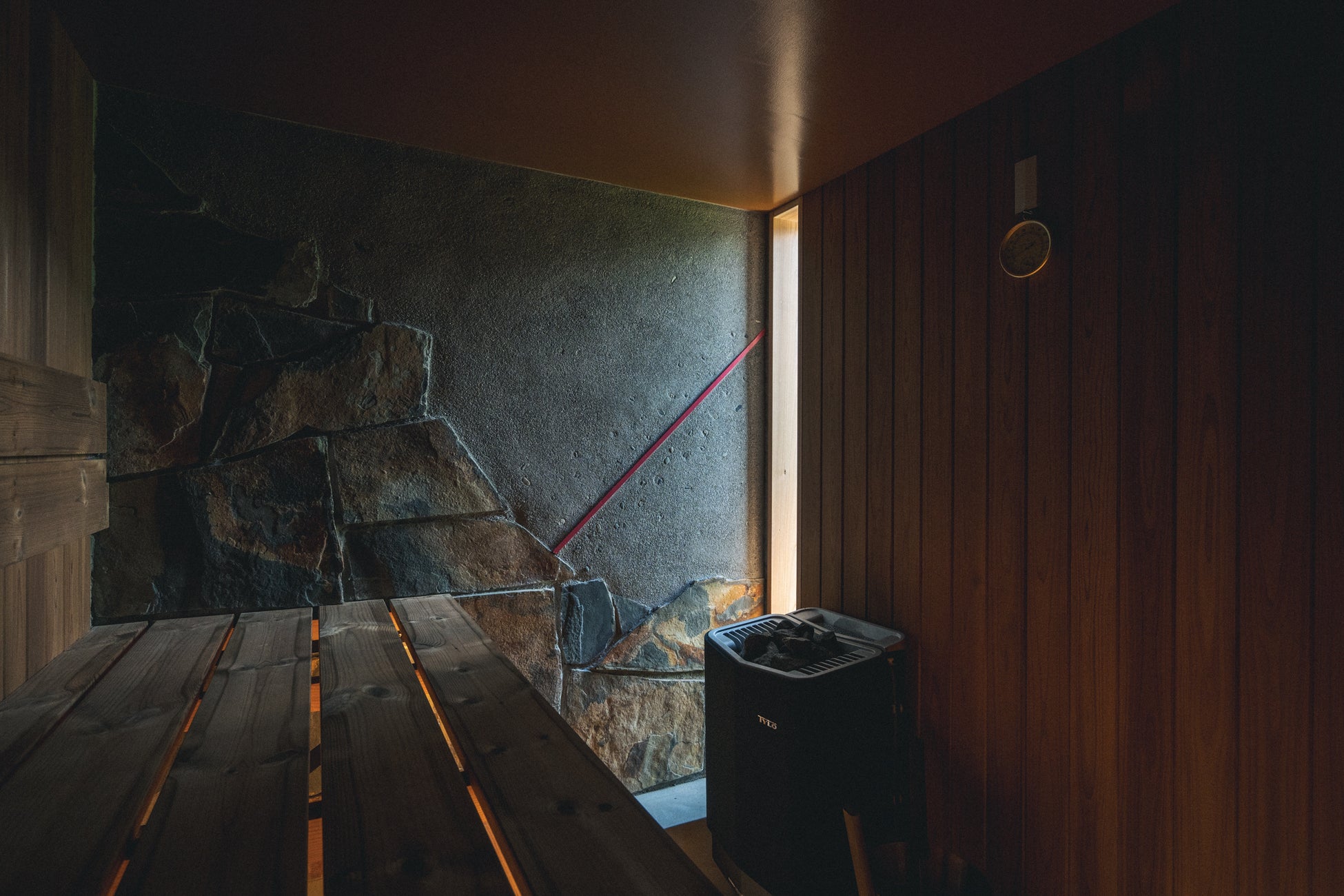 自然と人工が織りなす複層的な景色を眺めながら、フィンランド式サウナを楽しめる