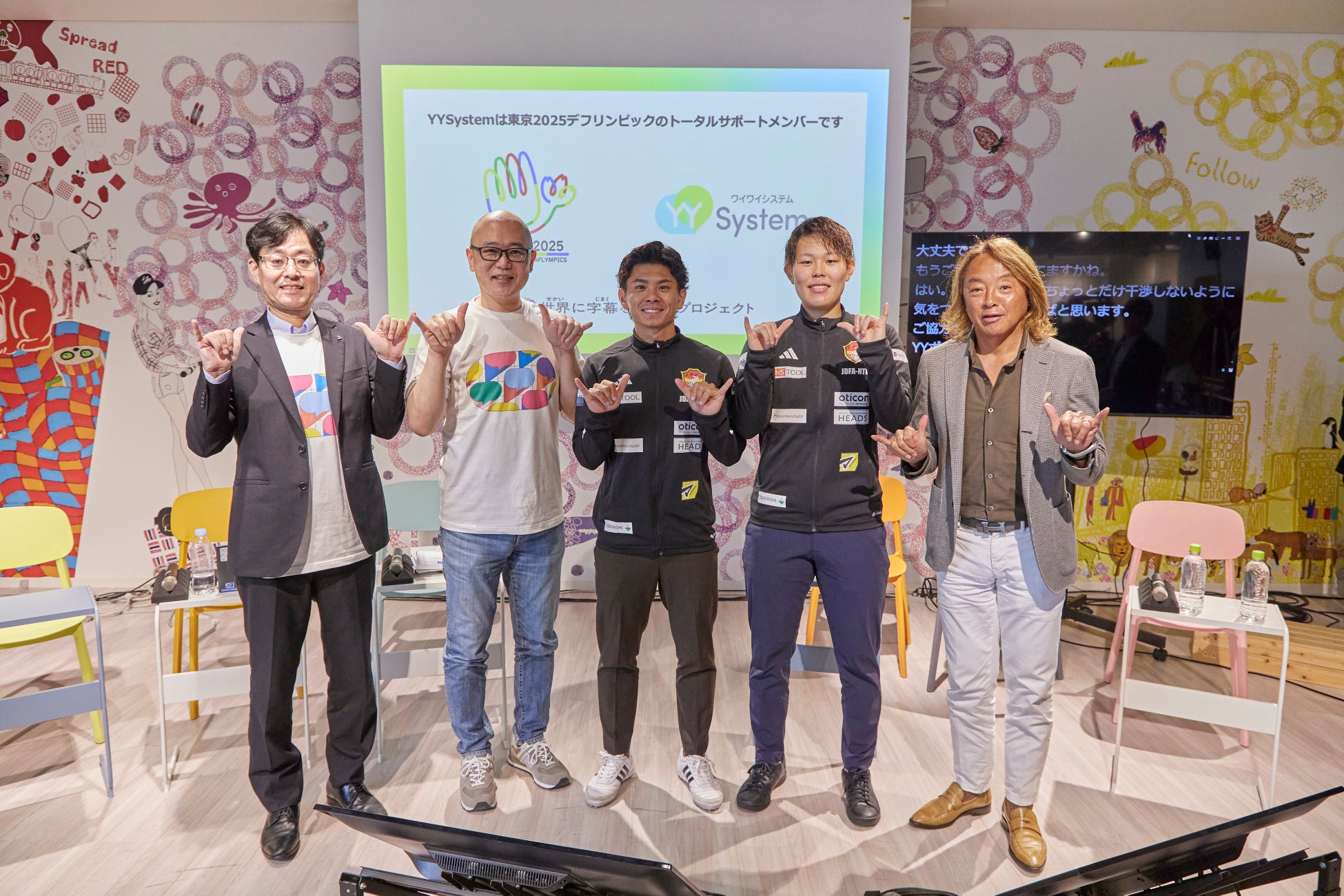 会がスタートすると、北澤豪さん・デフサッカー男女日本代表の林選手・國島選手が登場。11月開催のデフリンピックについて、國島選手は「今回の東京で行われるデフリンピックは、100年目というすごく大きな記念の大会になります。歴史的なタイミングで競技に出られることを嬉しく思います。」とコメント。今回のプロジェクトについて北澤さんは「生きている間に自分の国でデフリンピックを目撃できることは、そう無いタイミングなので、聞こえにくい人、聞こえる人たちも誰もがデフリンピックを見て感じたことを、世界に発信して行かなければと思いました。YYSystemのようなコミュニケーションツールは、メダルに近づける一つのシステムだと思います!」と期待を述べました。また、今後の目標や聴覚障害を持っている方に向けてのメッセージを問われると、林選手は「デフリンピックではサッカーを通して大会に参加するだけではなく、結果を残したいです。」と大会への意気込みを語り、國島選手は「一つの夢が阻まれても、諦めずに次の目標に向けて頑張りましょう。」とエールを送りました。