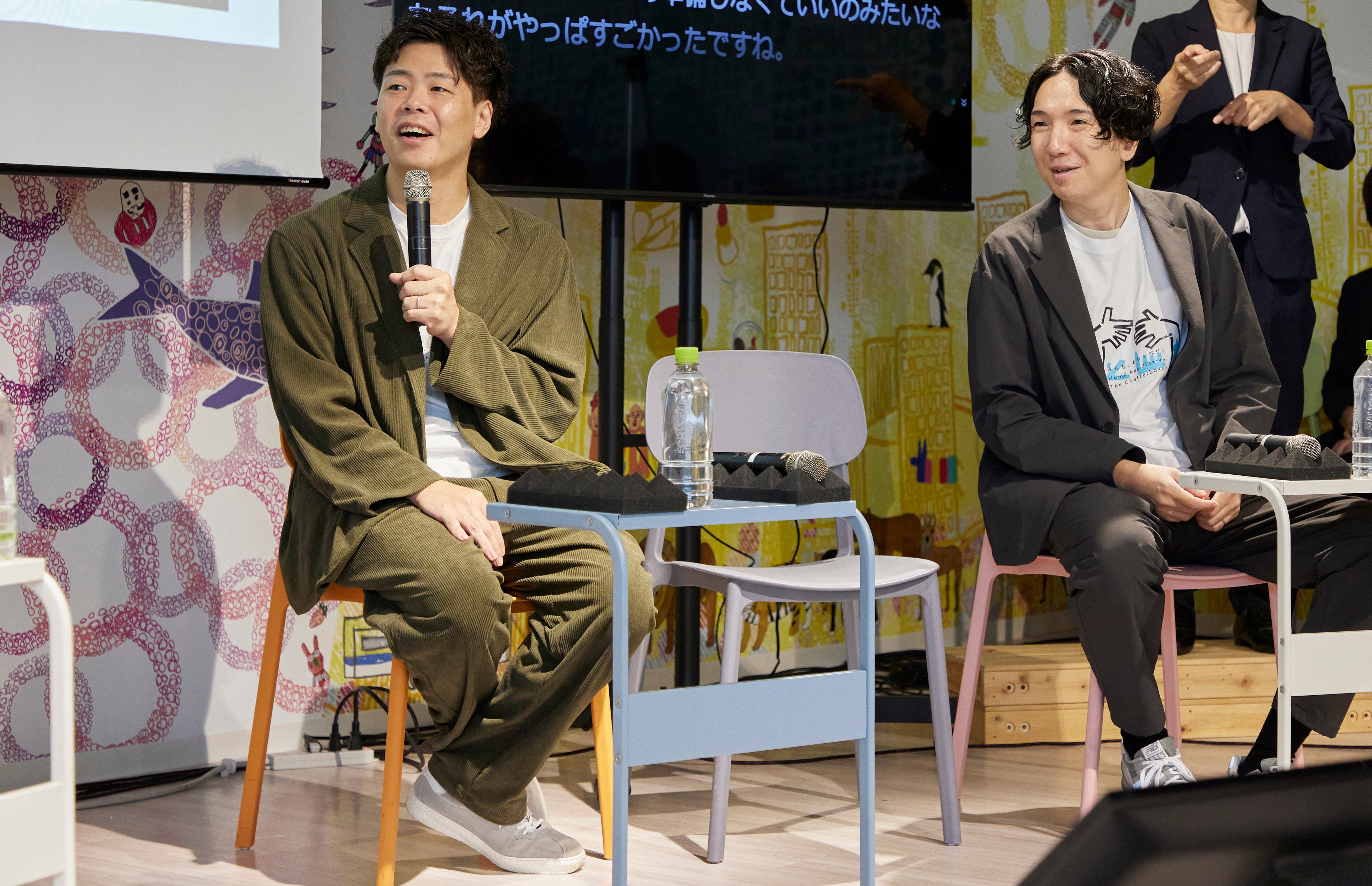 続いてのトークセッションには、今回のプロジェクトを応援されている、映画監督の河合健さん、映画プロデューサーの小澤秀平さんが登場。聞こえや言語の違う人たちを題材とした「みんな、おしゃべり!」という映画の公開を控えたお二人は撮影現場でのコミュニケーションについて「映画のろう出演者の方でYYSystemを使用している人が多く、現場でも実際に使用していましたが、精度の高さに驚き、すごいシステムがあるなと思いました。」と実際に映画の中でYYSystemを使用したことによって撮影がスムーズに進んだ経験を語りました。さらに、小澤さんは「YYSystemは異常な熱意と技術によって作られたものだなと思いました。」とシステムへの評価を述べました。